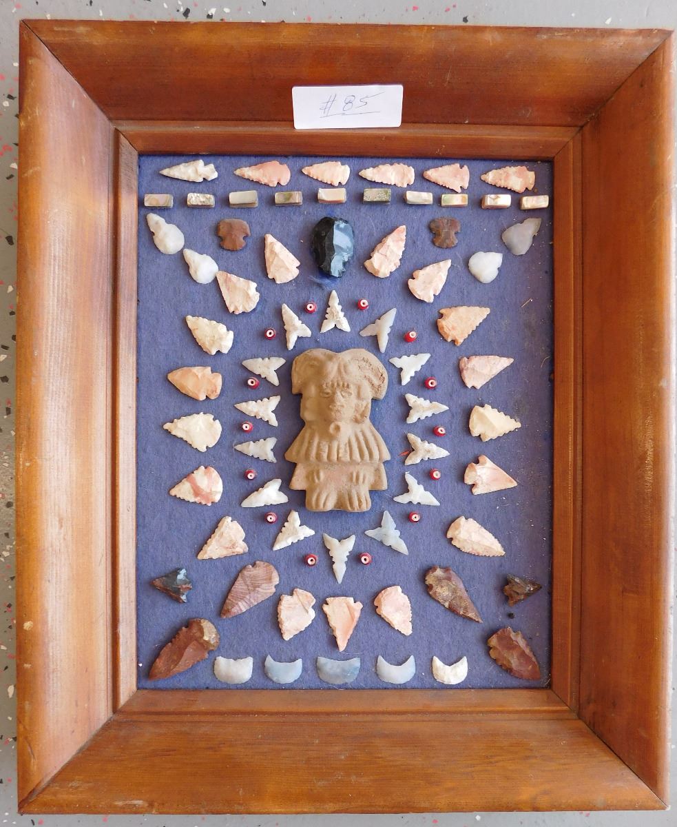 Artifact Display, historic to pre-historic periods. Consisting of flint, glass, clay and shell, this frame measures 18" x 15" x 3". From old Mexico. Nice display, notice the crescents on bottom. Condition: All items as found, see images. Shipping: $45.00, USA estimate only.