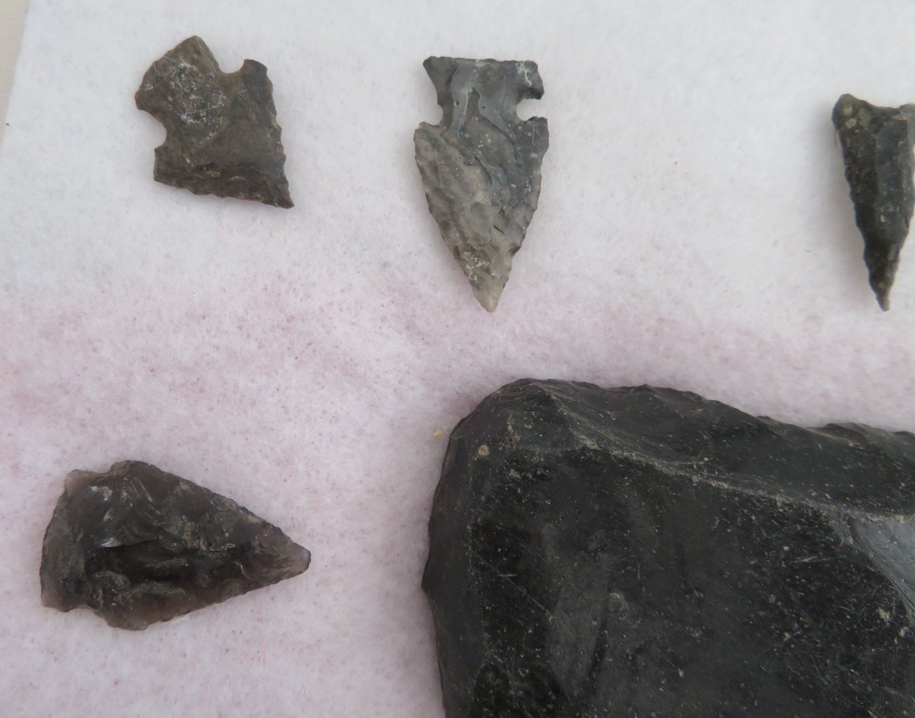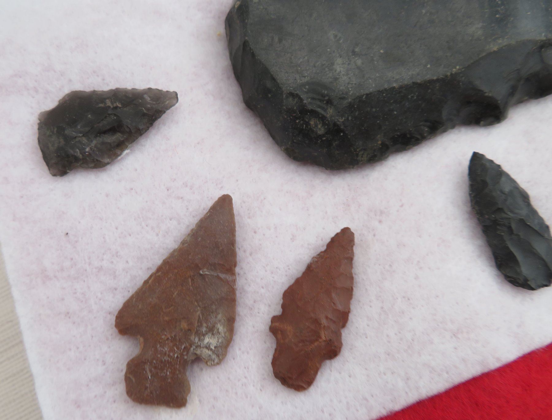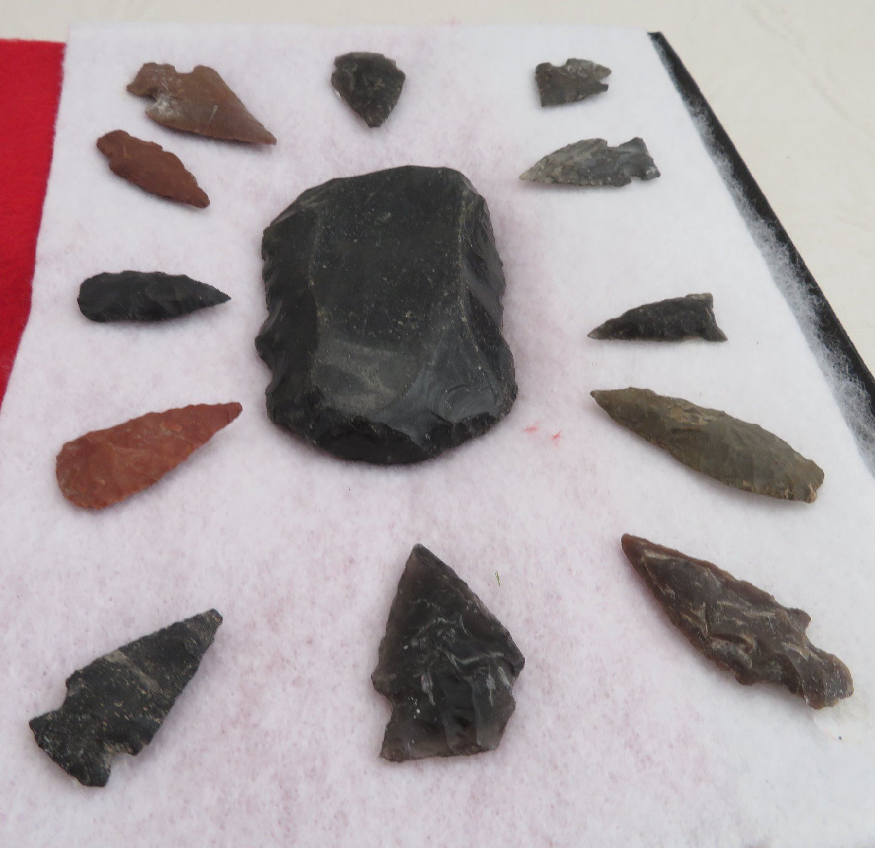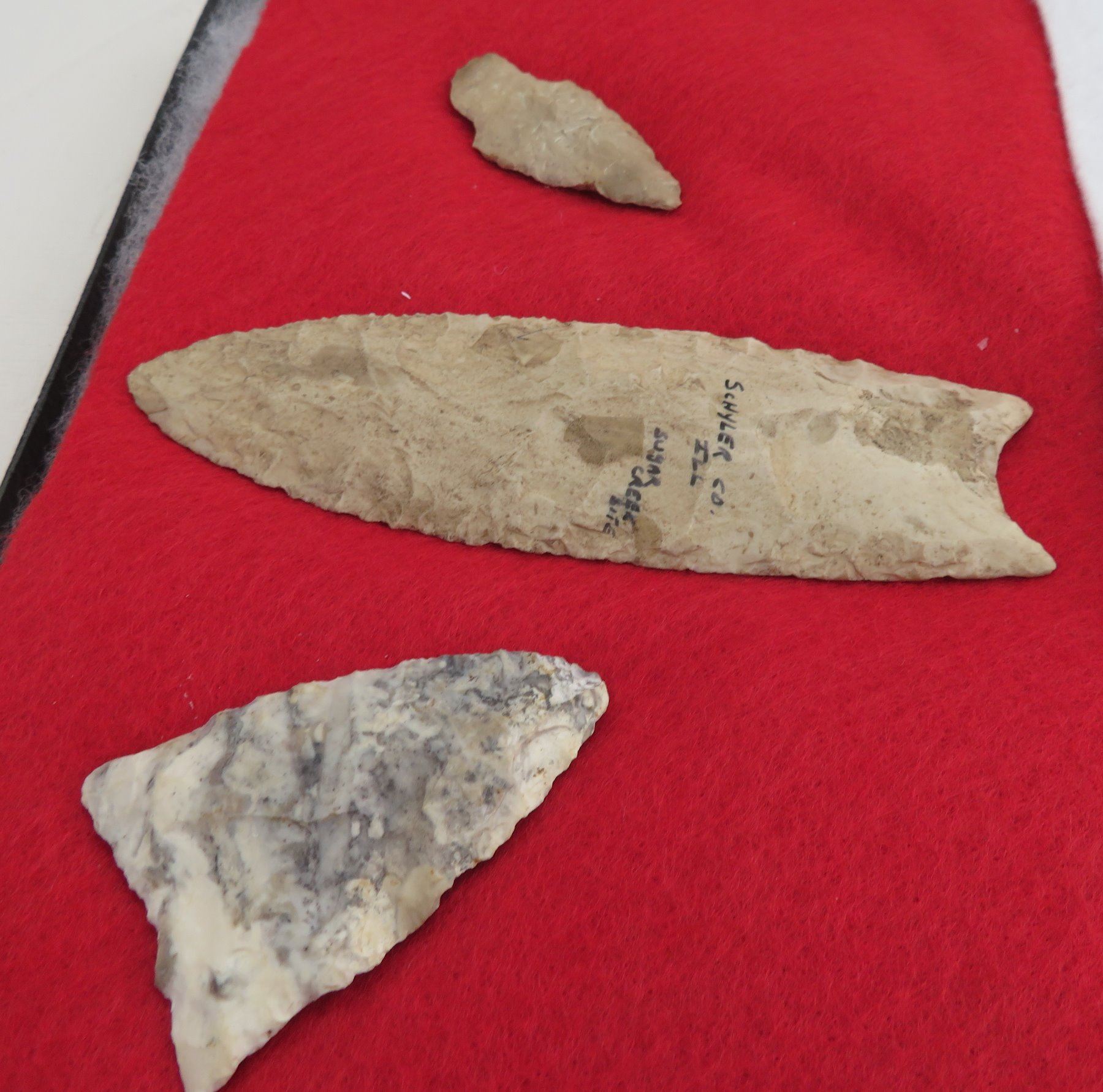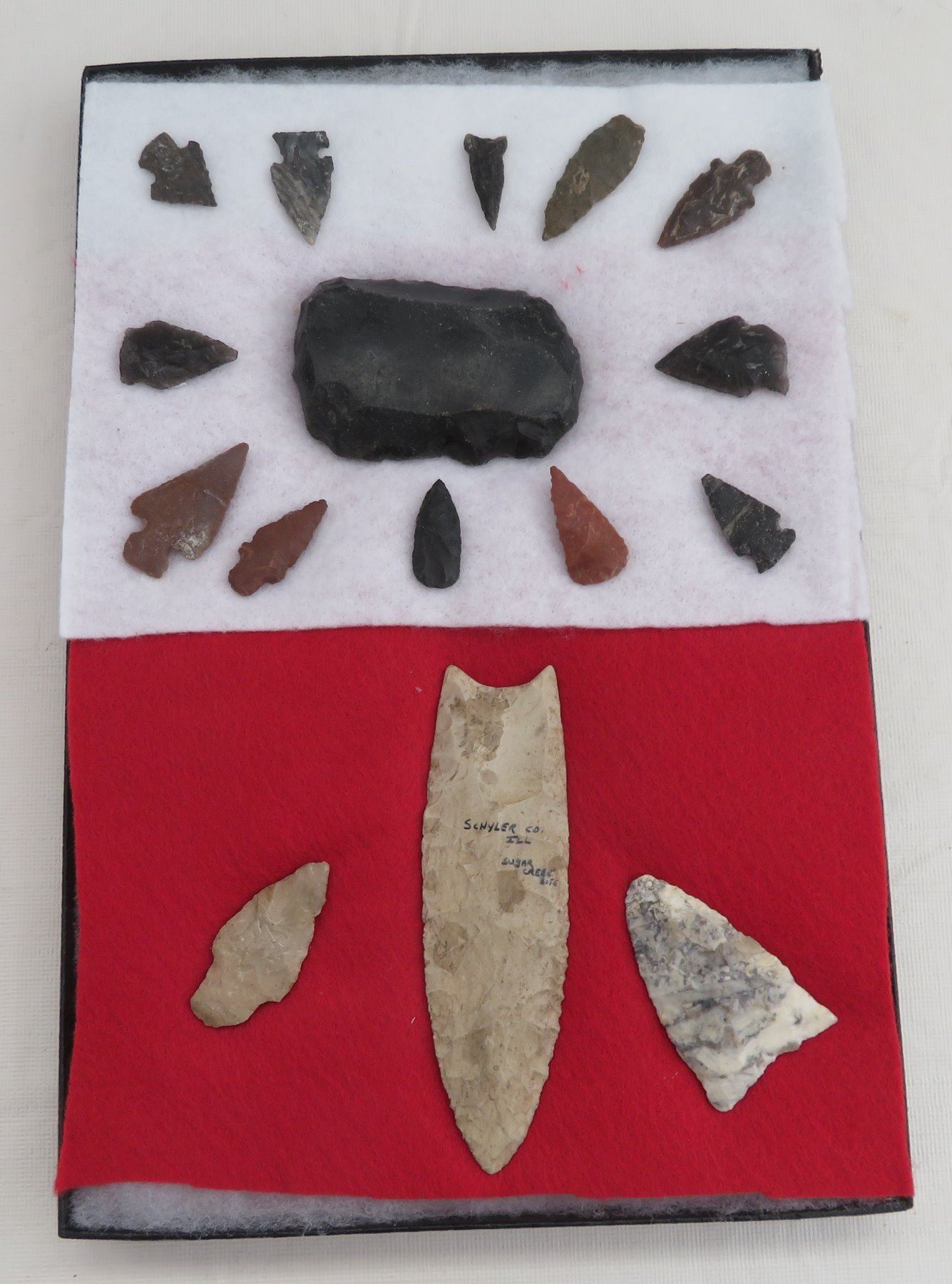 Artifact Frame, archaic to paleo periods. Made of chert and obsidian, the clovis measures 4 7/8". Clovis data: Schyler County, Illinois. Ex-Byron Anderson. Frame not included. Condition: As found, see images. Shipping: $30.00 w/insurance and signature, due to value.