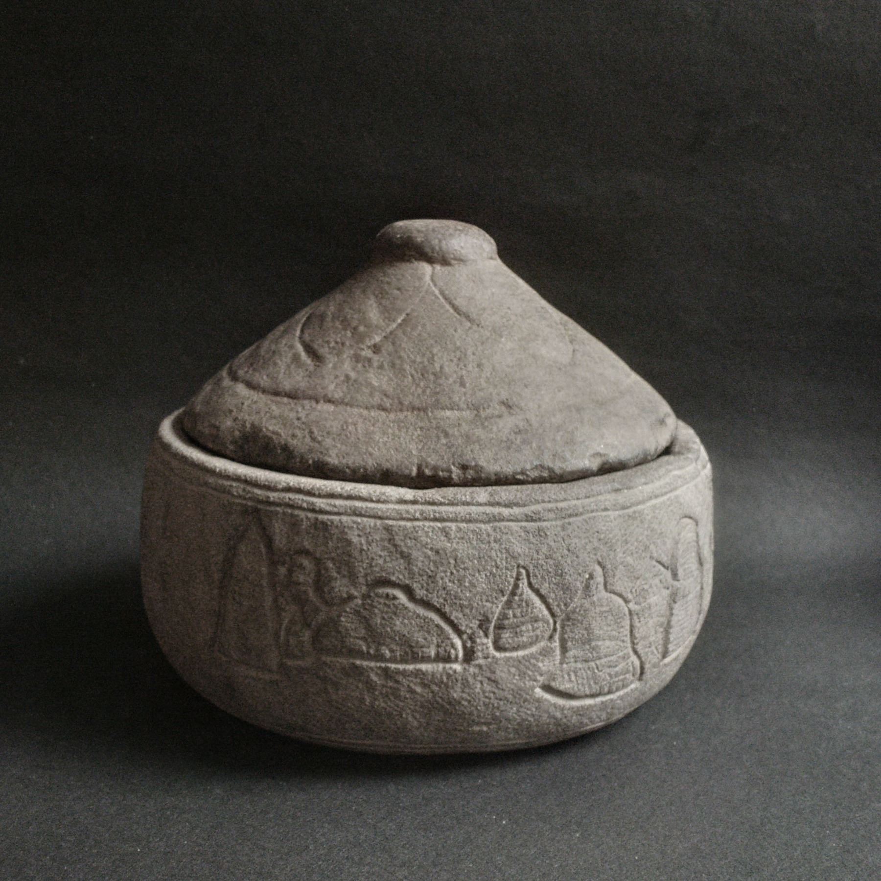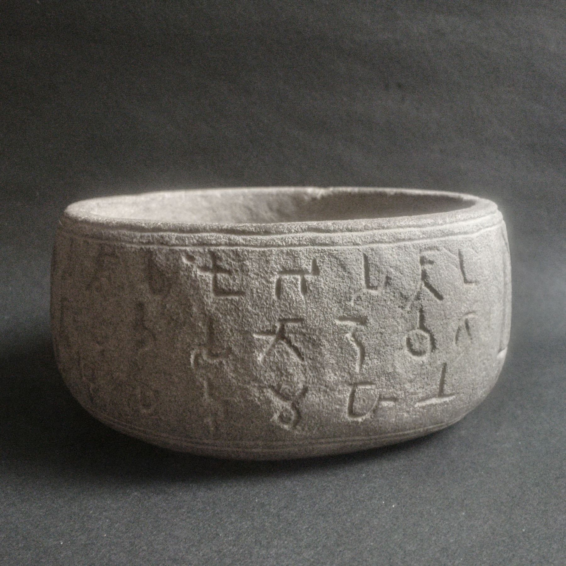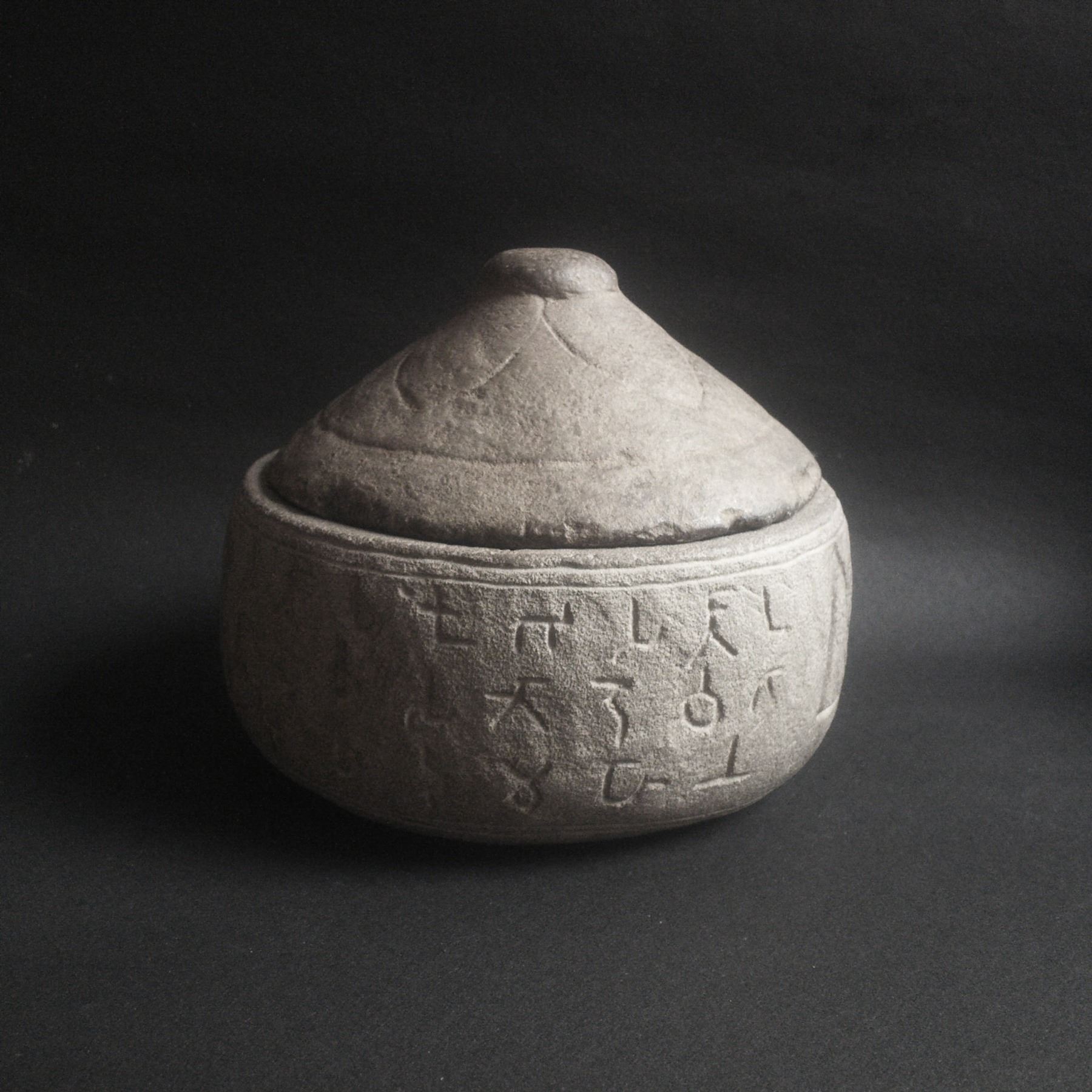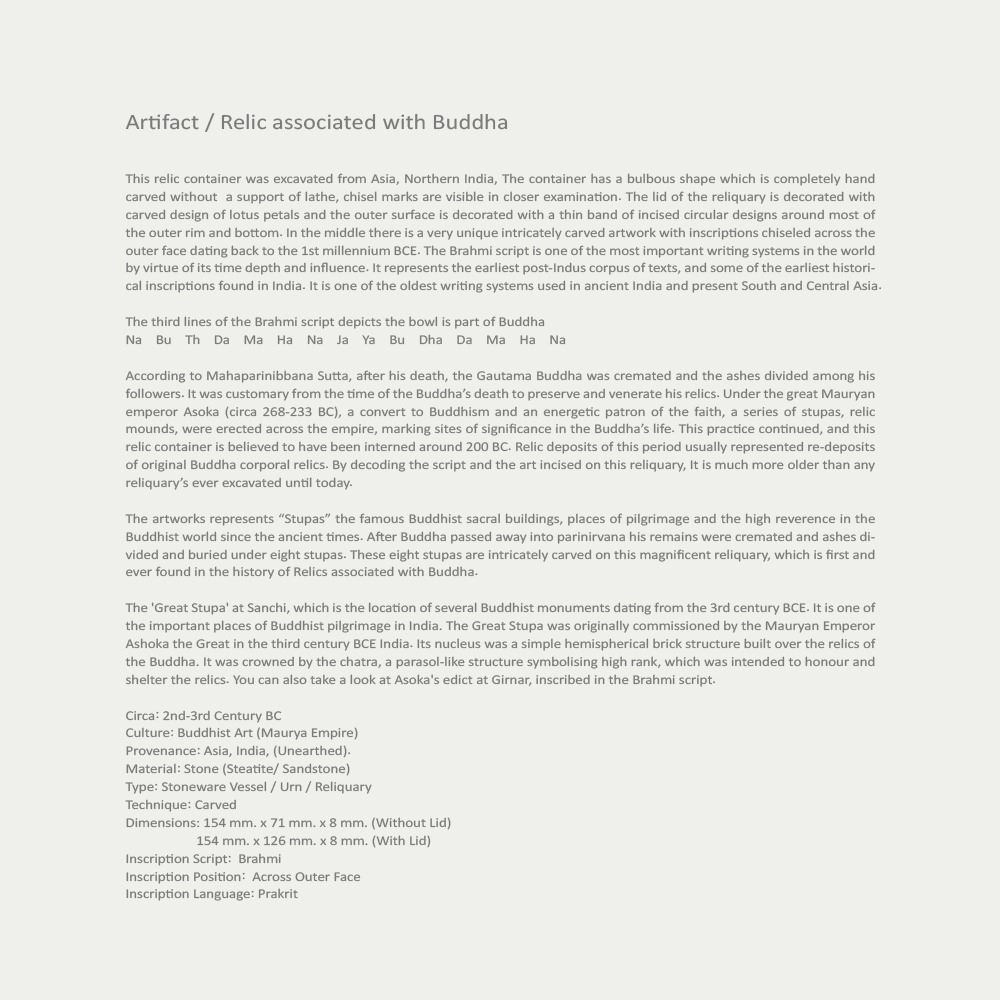 This relic container was excavated from Asia, Northern India, The container has a bulbous shape which is completely hand carved, chisel marks are visible under closer examination. The lid of the reliquary is decorated with carved design of lotus petals and the outer surface is decorated with a thin band of incised circular designs around most of the outer rim and bottom. In the middle there is a very unique intricately carved artwork and Brahmi inscriptions chiseled across the outer face dating back to the 1st millennium BCE. The Brahmi script is one of the most important writing systems in the world by virtue of its time depth and influence. It represents the earliest post-Indus corpus of texts, and some of the earliest historical inscriptions found in India. It is one of the oldest writing systems used in ancient India and present South and Central Asia. The third lines of the Brahmi script depicts the bowl is part of Buddha Na Bu Th Da Ma Ha Na Ja Ya Bu Dha Da Ma Ha Na According to Mahaparinibbana Sutta, after his death, the Gautama Buddha was cremated and the ashes divided among his followers. It was customary from the time of the Buddha’s death to preserve and venerate his relics. Under the great Mauryan emperor Asoka (circa 268-233 BC), a convert to Buddhism and an energetic patron of the faith, a series of stupas, relic mounds, were erected across the empire, marking sites of significance in the Buddha’s life. This practice continued, and this relic container is believed to have been interned around 200 BC. Relic deposits of this period usually represented re-deposits of original Buddha corporal relics. By decoding the script and the art incised on this reliquary, This is much more older than any reliquary’s ever excavated until today. The artworks on the reliquary represents “Stupas” the famous Buddhist sacral buildings, places of pilgrimage and the high reverence in the Buddhist world since the ancient times. After Buddha passed away into parinirvana his remains were cremated and ashes divided and buried under eight stupas. These eight stupas are intricately carved on this magnificent reliquary, which is first and ever found in the history of Relics associated with Buddha. The 'Great Stupa' at Sanchi, which is the location of several Buddhist monuments dating from the 3rd century BCE. It is one of the important places of Buddhist pilgrimage in India. The Great Stupa was originally commissioned by the Mauryan Emperor Ashoka the Great in the third century BCE India. Its nucleus was a simple hemispherical brick structure built over the relics of the Buddha. It was crowned by the chatra, a parasol-like structure symbolising high rank, which was intended to honour and shelter the relics. For your reference: Asoka's edict at Girnar, inscribed in the Brahmi script. Circa: 2nd-3rd Century BC Culture: Buddhist Art (Maurya Empire) Provenance: Asia, India, (Unearthed). Material: Stone (Steatite/ Sandstone) Type: Stoneware Vessel / Urn / Reliquary Technique: Carved Dimensions: 154 mm. x 71 mm. x 8 mm. (Without Lid) 154 mm. x 126 mm. x 8 mm. (With Lid) Inscription Script: Brahmi Inscription Position: Across Outer Face Inscription Language: Prakrit Nº of Script: 49 Artwork: Yes (Eight Stupa's Lotus)