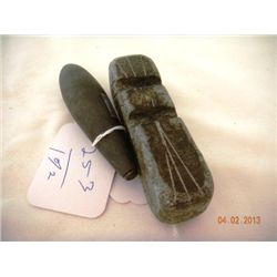Plummet Stone and shaft straightener. Plummet Stone measures 2 3/4 inches by 1 inch. Shaft straightener measures 4 inches by 2 inches. Good Condition.