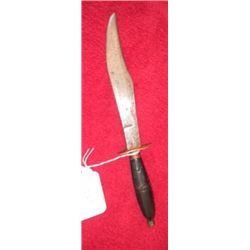 Bowie Knife from Brazil, measures 13 inches by 2 inches. Stainles steel blade with bone handle. Circa 1970. Condition fair has slight stains with chip