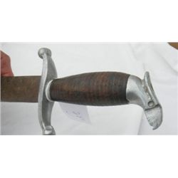 Mexican sword Measuring 27 by 4 inches. There is an eagle head on the handle. The handle is made from leather washers. Circa 1940, the blade has li