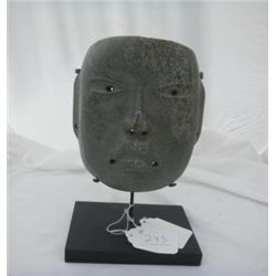 Olmec Human Stone Mask with mask, measuring 7 by 7 by 2 inches. This item has a stand. Condition slight chip on nose and forehead. This item has a