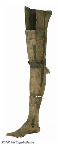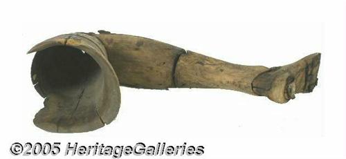 <B>Artificial Wooden Leg Made for a Confederate Amputee</B></I> Belonged by oral tradition to a Confederate veteran from Abbeville, Mississippi. Elaborately constructed in four distinct articulated segments: foot, ankle, calf, and lower leg. Wearer's stump fit into reinforced opening at top. Made of wood, iron hinges, leather straps, hemp rope, and wooden pegs. Fascinating visual appeal as a display item. Fine old patina. Length when extended is 34". Lot:251