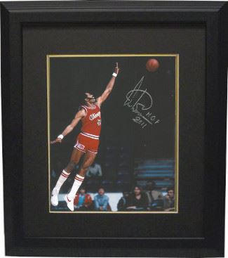 Artis Gilmore played in the ABA and the NBA. Artis was inducted into the Naismith Memorial Basketball Hall of Fame on August 12, 2011. Gilmore followed 5 All-Star seasons with the Kentucky Colonels of the ABA by becoming the 1st overall pick of the 1976 NBA dispersal draft by the Chicago Bulls, which was held after the ABA was disbanded, as four teams transferred to the NBA. In Gilmore's complete pro basketball career, he was an eleven-time All-Star, the ABA Rookie of the Year, and an ABA MVP, and he remains the NBA career leader for field goal percentage. Nicknamed "The A-Train", the 7' 2" Gilmore once played in 670 consecutive games. Artis Gilmore has hand autographed this Chicago Bulls 8x10 Photo with HOF 2011 inscription. Certificate of Authenticity from Athlon Sports. Custom Black Mat and Premium Black Color Framed as shown.