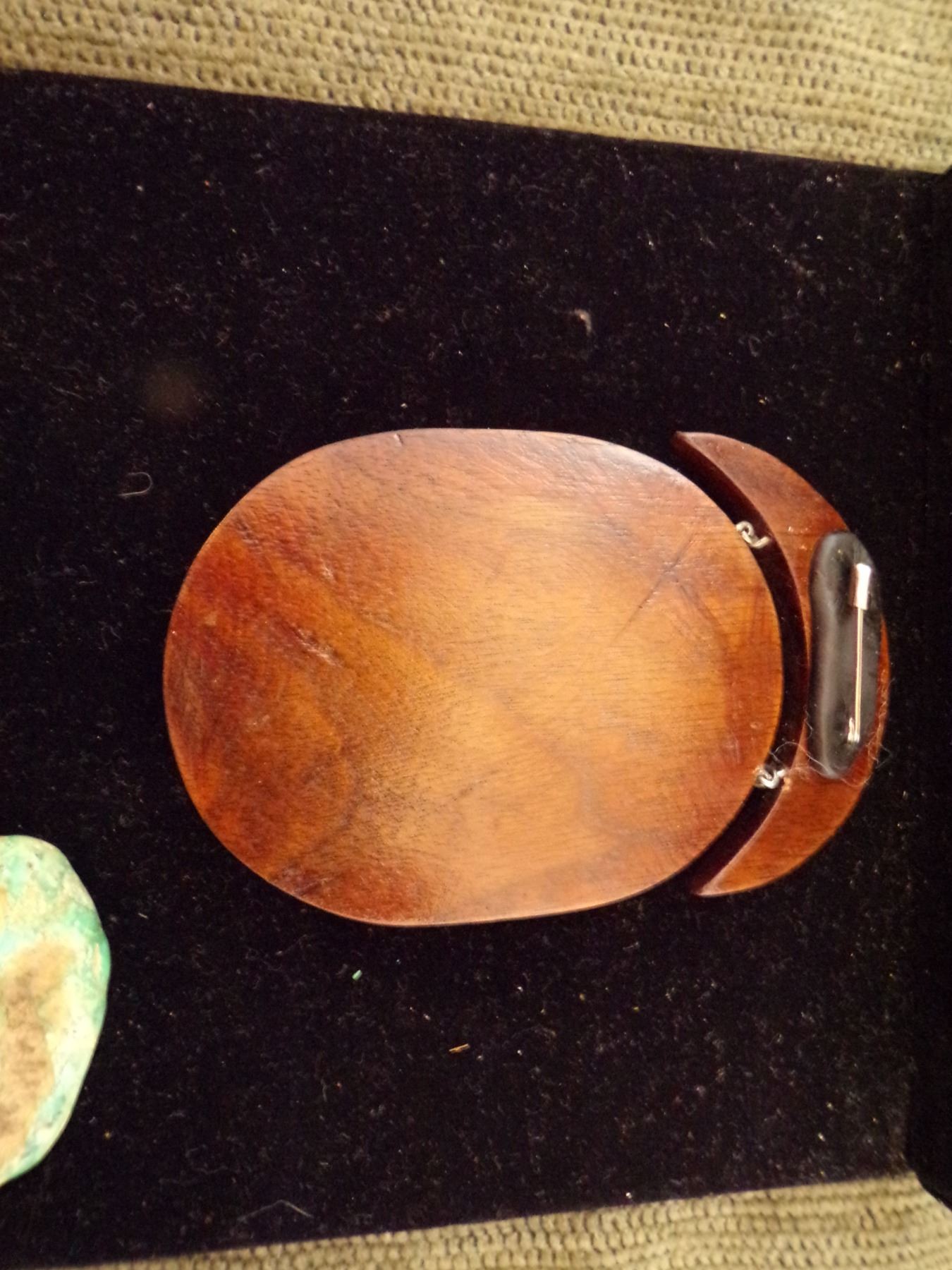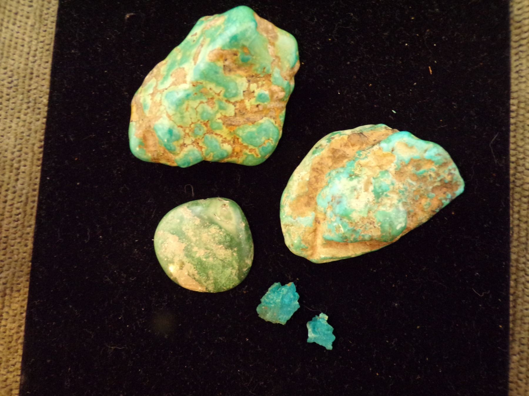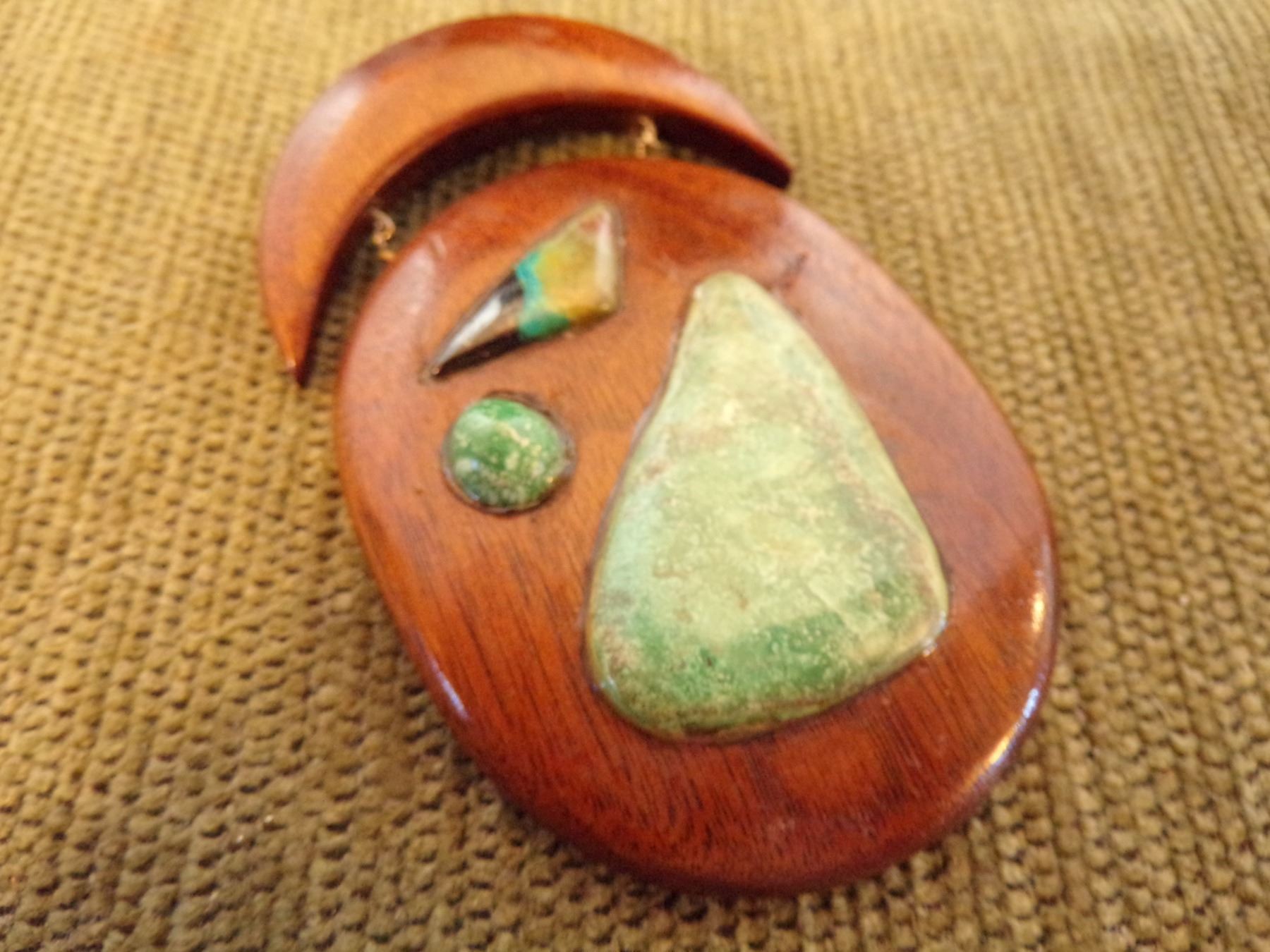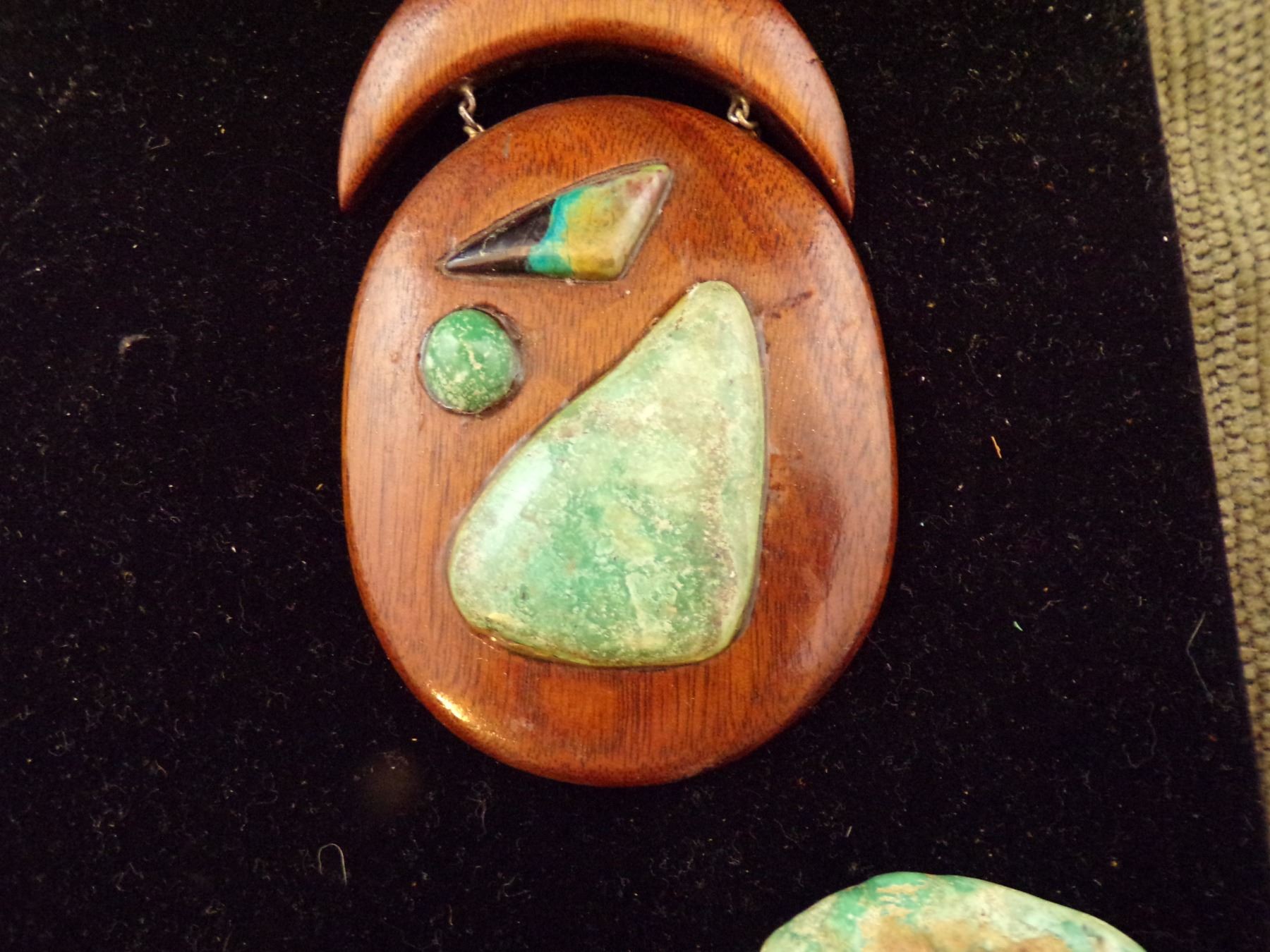 Artisan Crafted Pin and Turquoise Specimens, includes 1. Wood pin with turquoise and chrysacolla, measures 3'' x 4'' 2. Six Beautiful Turquoise Specimens, total carat wt. of 835.20, largest measures 2 5/8''L x 2''W x 1.25''H