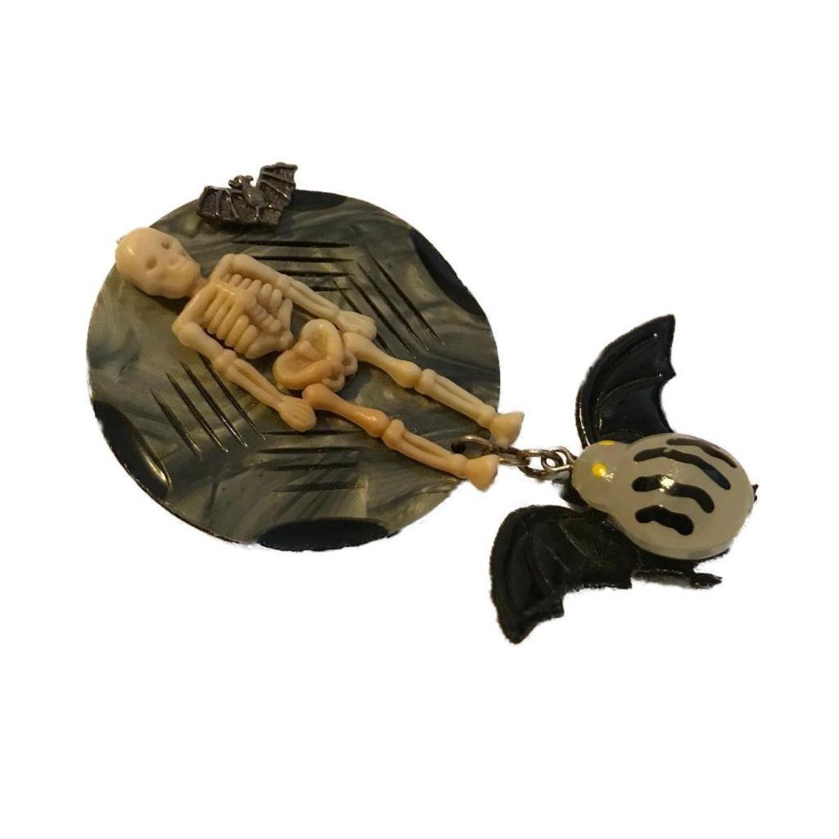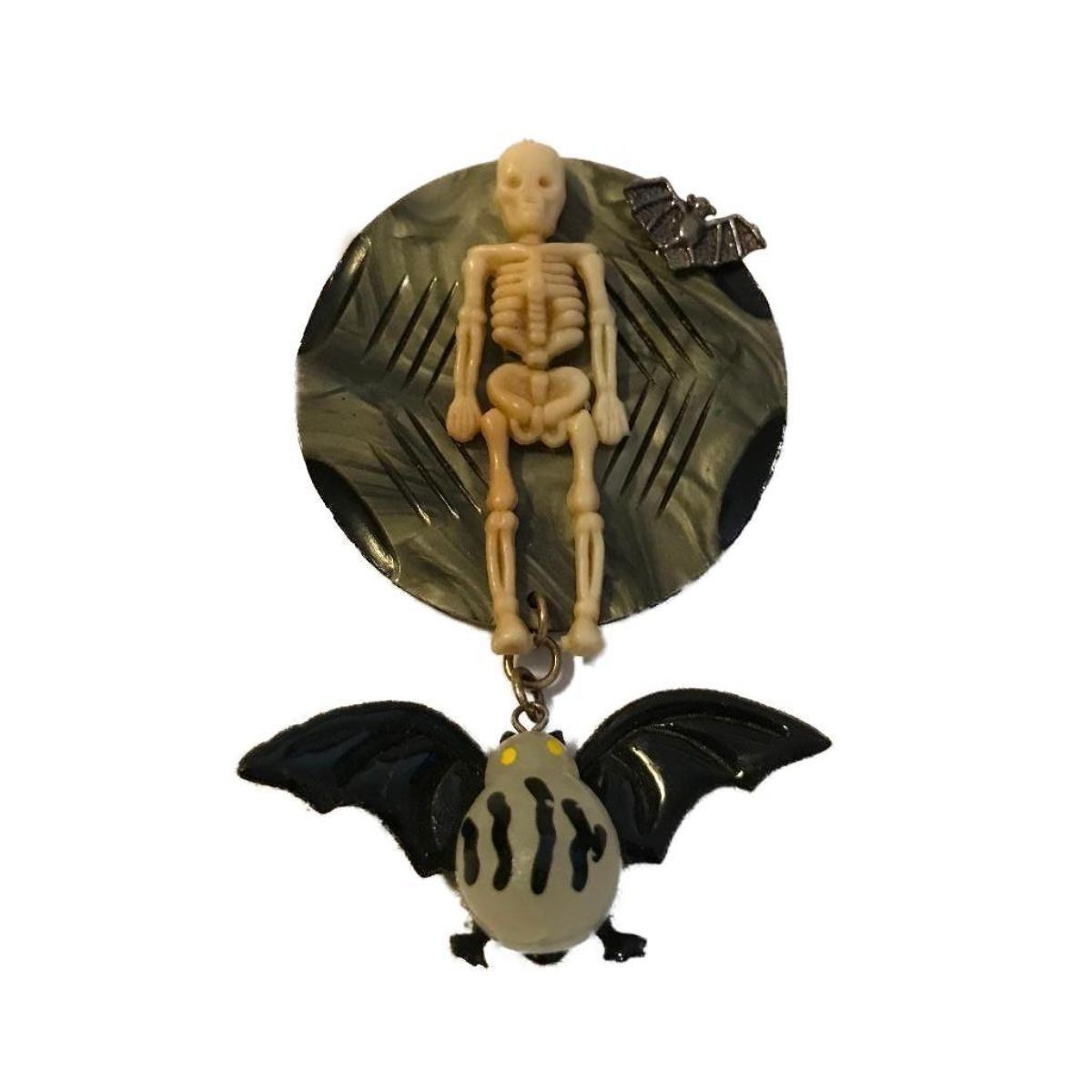 Artisan creation, Halloween skeleton & bat brooch. Created using a re-purposed button a small vintage plastic skeleton, tiny metal bat & a dangling bat hanging from the bottom. Made by Loralie Kay Designs. 3" L X 1 3/4" W.Â