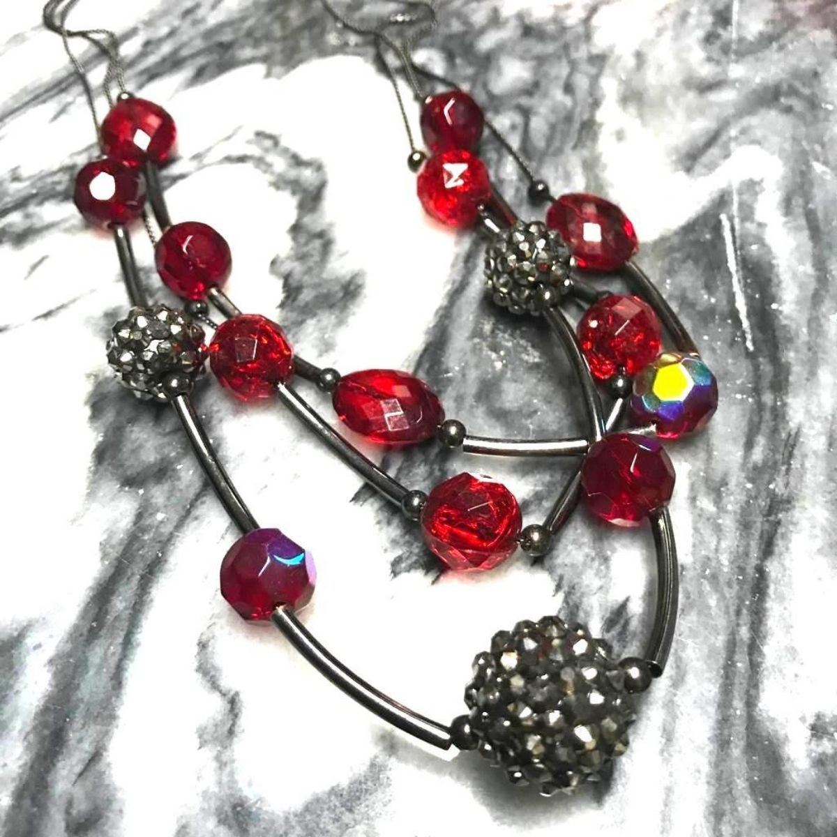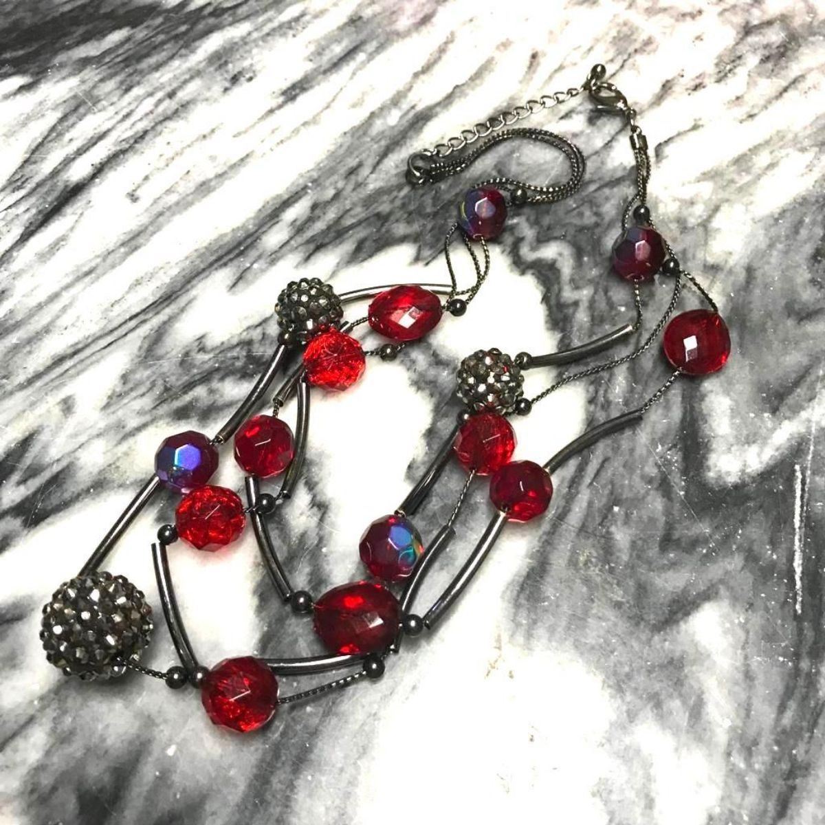 Artisan made necklace with gunmetal & crystal beads, triple strand 16 - 18" necklace.