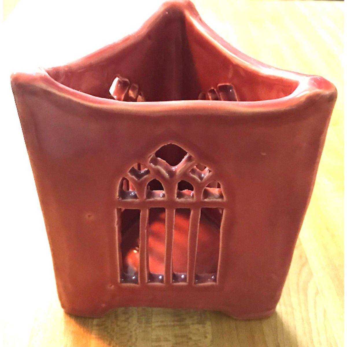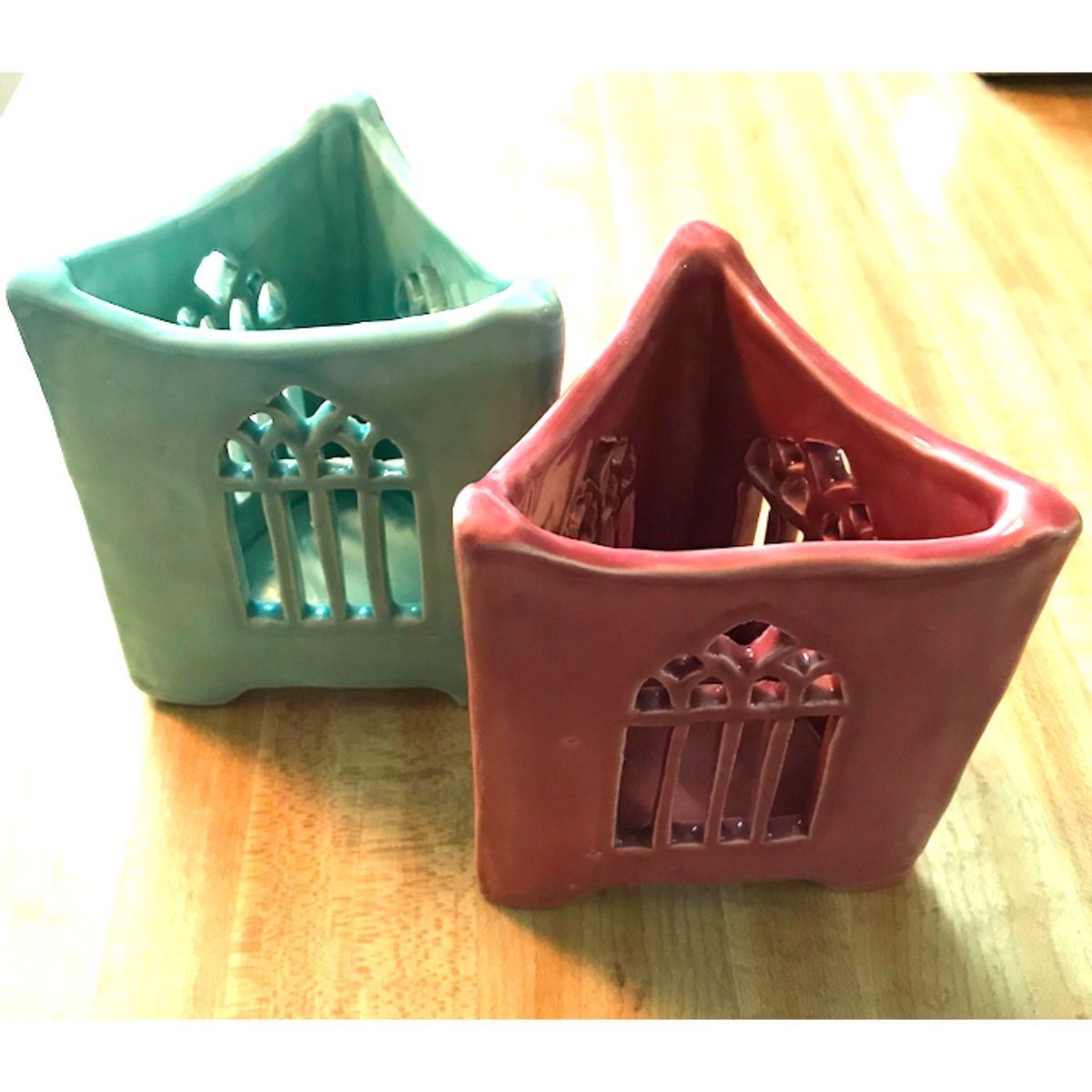 Artisan handmade, gothic-style, triangular-shaped, pierced ceramic window tealight, table candle holders, in pink & green.  Made by Columbia South Carolina artist, inspired by the windows of the Gothic Revival Rose Hill Plantation House in Bluffton, SC. 4 1/2" H X 4" W.