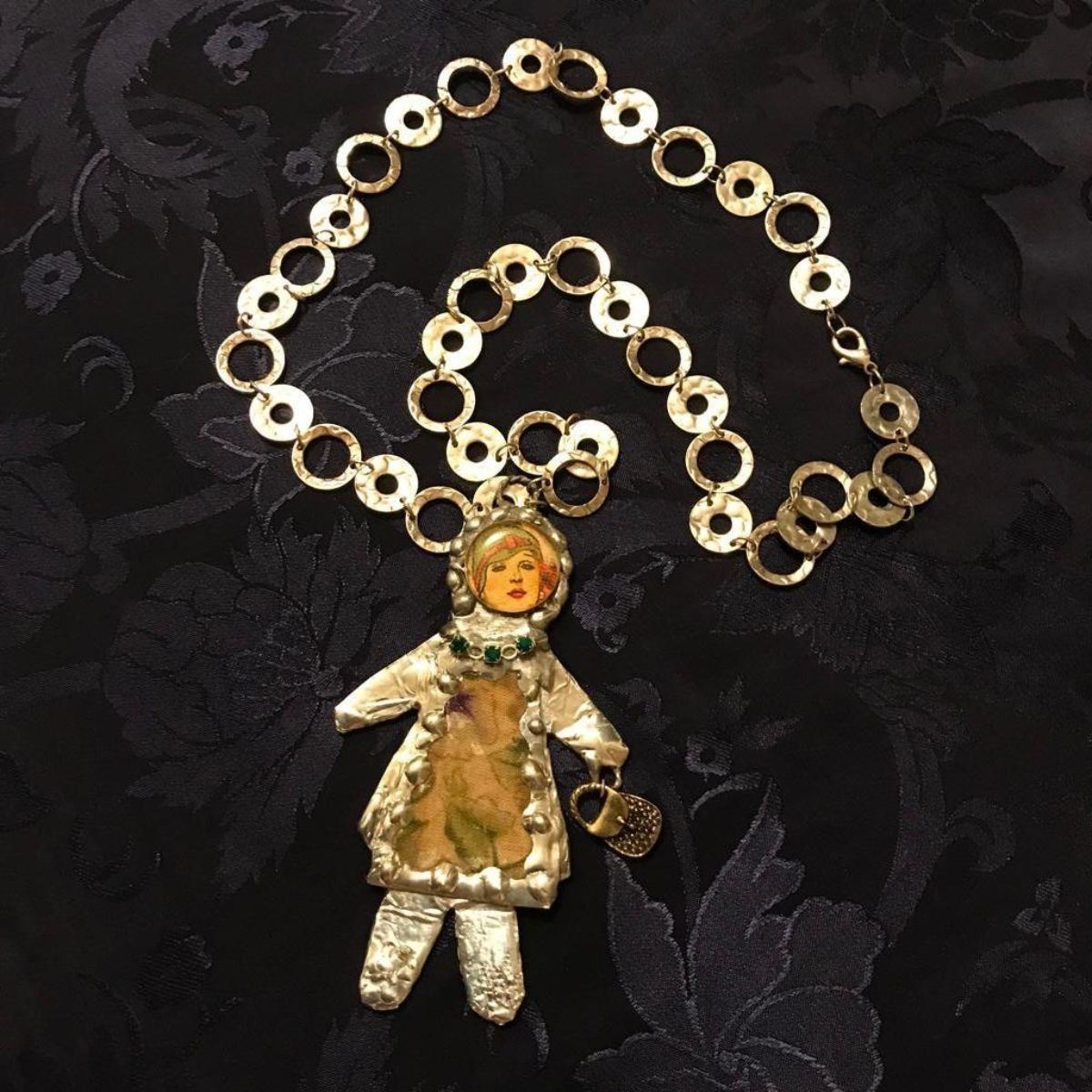 Artisan hand-made collage, mixed media doll necklace, made with re-purposed materials; round 1/2" silver metal links, cloth from a vintage dress, tin, emerald green rhinestones for the doll's necklace, a small brass purse embellishment & a vintage art deco fashion model illustration fashioned into a bead as the head of the doll. 3 3/4" H X 2 1/4" W doll pendant on 23" L chain.Â