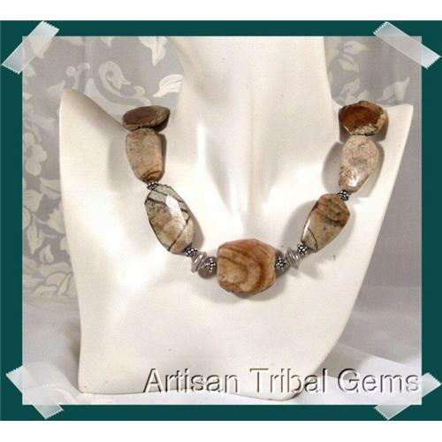 PLEASE NOTE I only ship to Canada and USA. If paypals is used the address MUST be confirmed and I require a signature on all paypals shipments. Thanks Steven. <P>Simply a grand presentation of huge fancy picture agate stones coupled with hilltribe silver and completed to perfection with sterling silver 's' closure. The stones are fairly uniform with the center one measuring 31x31x9mm and for those not familiar with metric 25mm=1". The necklace measures 18.5" in length and has a gram weight of 117 gram...so is a VERY substantial piece of jewelry worthy of consideration.