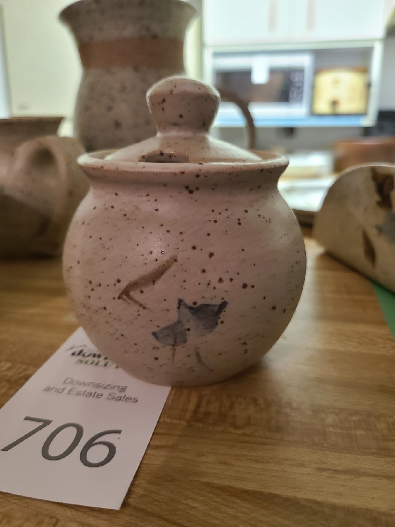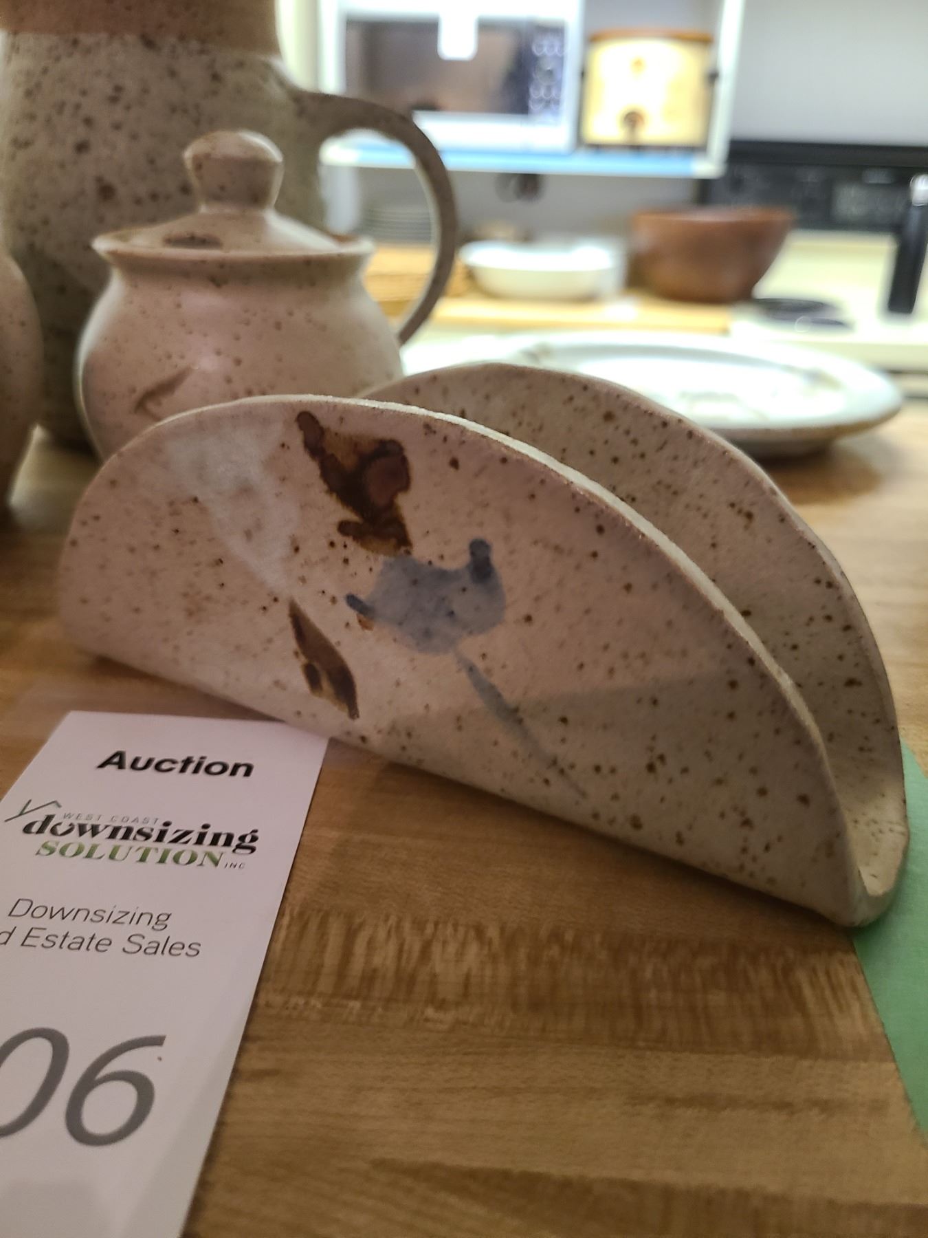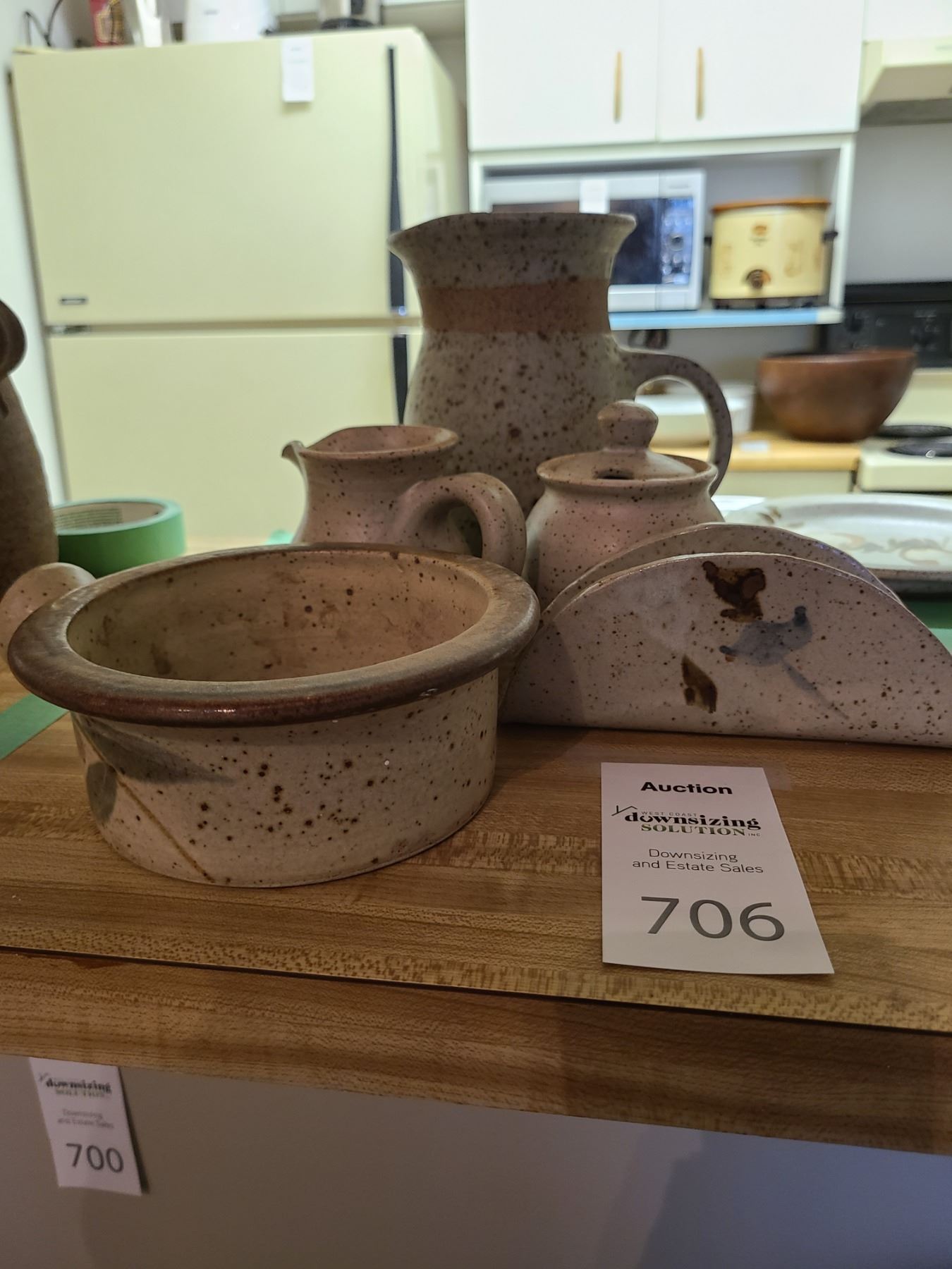 Pottery includes pitcher, sugar and creamer, napkin holder, and bowl with handle. Pickup at 9 am.