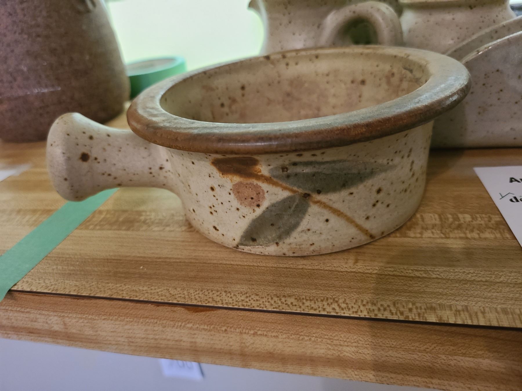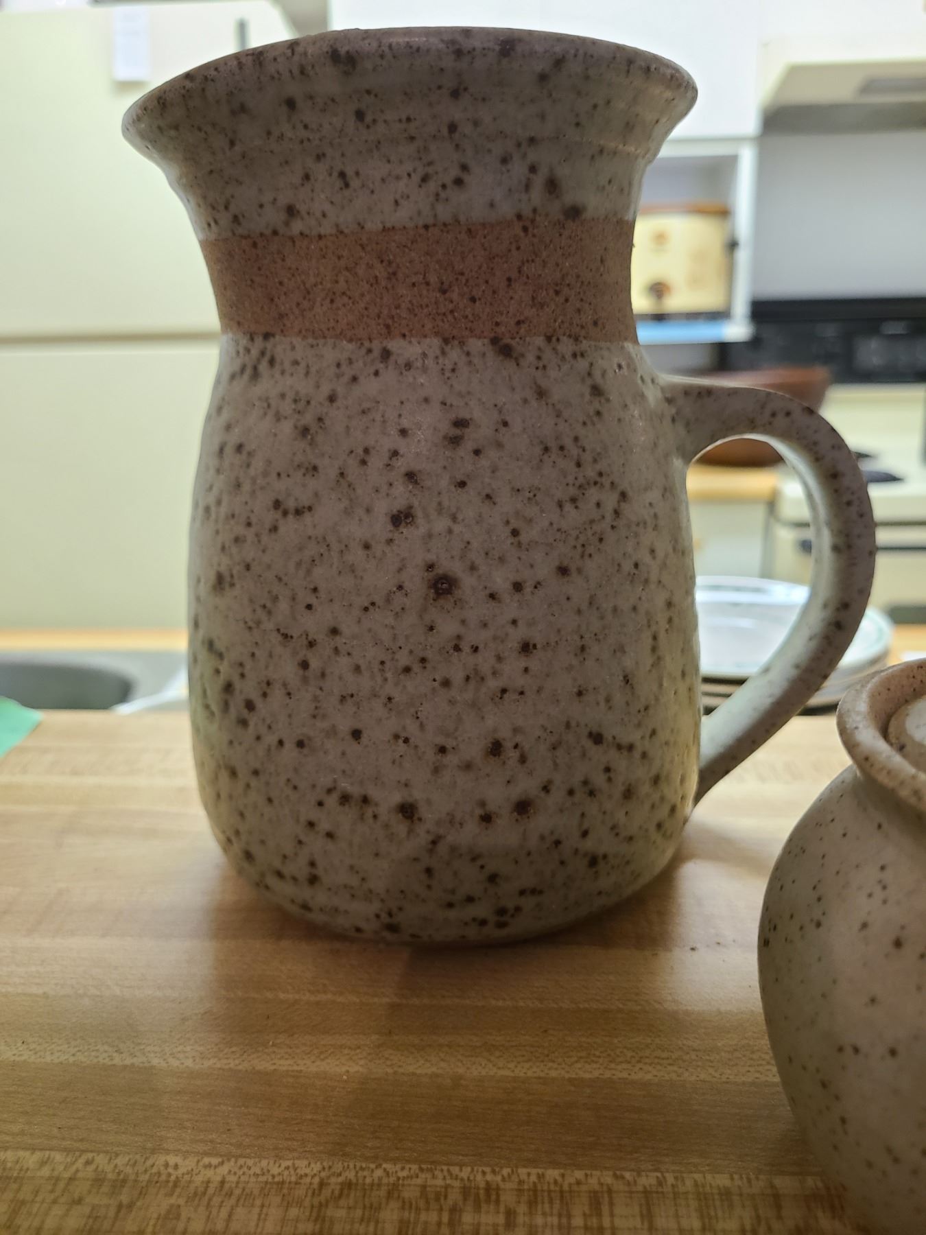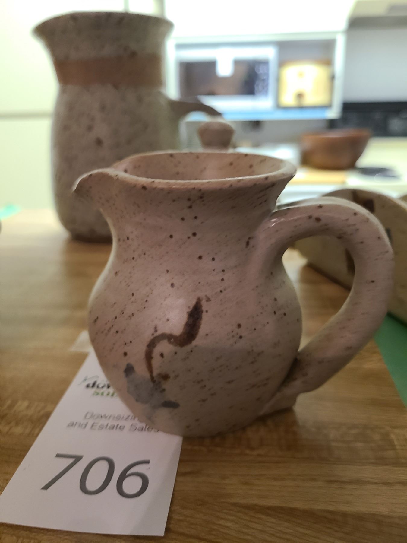Pottery includes pitcher, sugar and creamer, napkin holder, and bowl with handle. Pickup at 9 am.