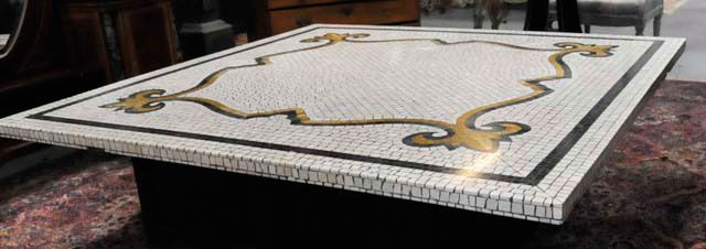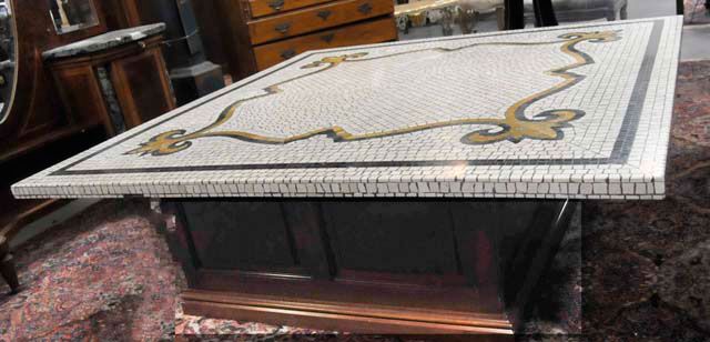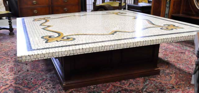 Mahogany pedestal base with raised panel detail, some tiles missing from edge, original purchase price $4,000. Approx. 60" square x 19" H. Please read our terms of sale.