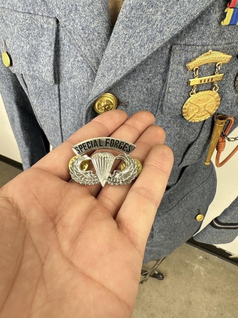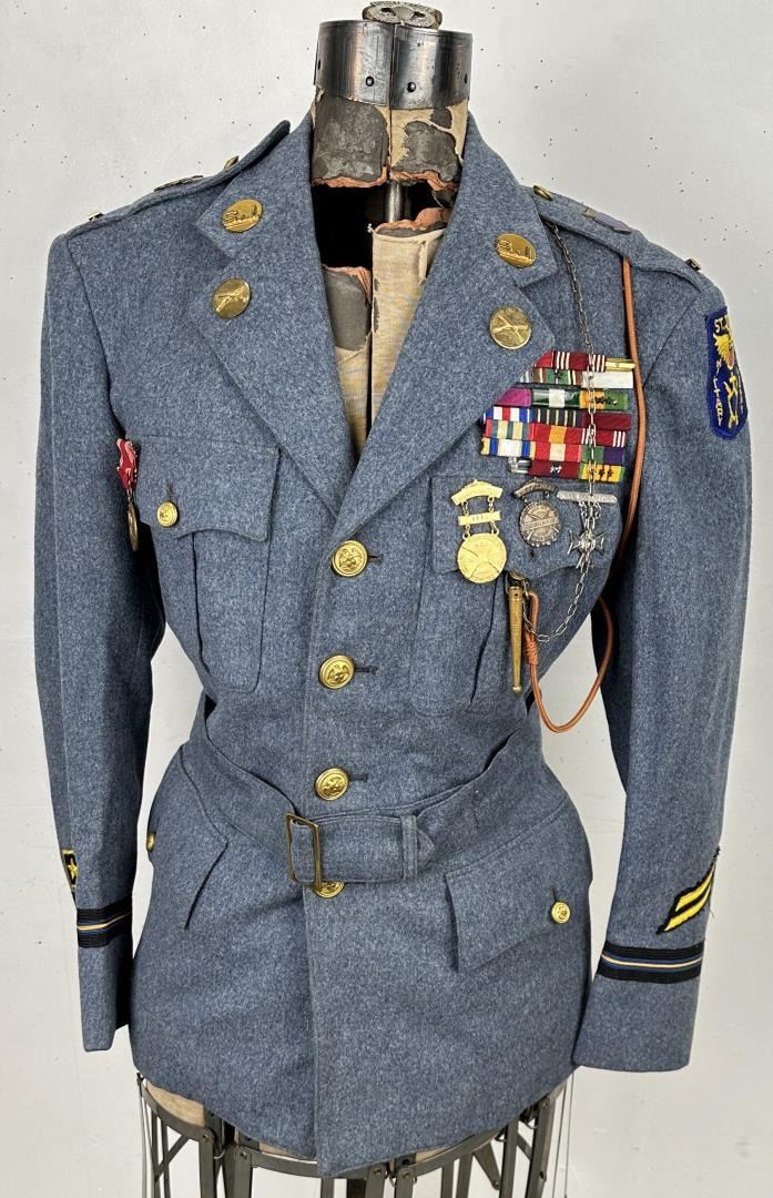 Nametag inside, large number of military medals and commendations. Daro Flood (1954 - 2017) was active/lived in Arizona. Daro Flood is known for Portrait bust Indian and cowboy sculpture. Daro Flood was a jeweler who made the decision to fully dedicate himself to realist sculpture. His studio is in Arizona, and he derives his subject matter from personal experiences depicting the people and places with which he has had contact. American Indians of the western United States are a favorite subject, and he has received commissions for public art. Longtime Jackson resident Daro M. Flood died Dec. 23, 2018 at his home in Jackson. He was 63. His family and friends provided the following. Daro Flood was born Aug. 24, 1954, to Dick Flood Sr. and Geraldine Flood, in Jackson Hole, WY. His older brother was Dick Flood II. After finishing high school in Scottsdale, Arizona, Daro was appointed conservator of the museum collections of the Alaska State Museum in Juneau, Alaska. Art was a mainstay of Daro’s life. His father opened the first art gallery in Jackson, Trailside Gallery, and his brother owned Main Trail Gallery. Daro himself was best known for his sculptures and paintings, but was hailed as a multitalented artist. Two longtime friends offered the following words on Daro: Daro is a very special person. In my 50-plus years of being with and working with very creative people, including accomplished artists, versatile artisans and highly capable craftsman, I have never known anyone who mastered so many aspects of all those endeavors. He truly was a many-faceted, amazingly capable artist, artisan and craftsman all rolled into one. He spent his whole life learning and mastering skills that for the most part are rarely mastered by very many people nowadays. He is the only person I have ever met that I would truly call a Renaissance Man — with capital letters. He was ‘a man apart’ in terms of modern society, but in a good way. He had great skills with his hands, but he also had the closest thing these days to a 19th century sensibility about nature and the natural world around him. He knew and understood things that few modern people do. He was one of the few people I have ever known that could be dropped into the middle of the wilderness and make do for himself just fine. His great excitement and enthusiasm for making things was infectious and marvelous. I’m all the sadder that I was not able to spend more time with him. I will miss him always. Patrick Stewart, former senior curator at Amon Carter Museum of American Art in Fort Worth, Texas. I have known Daro Flood since he was a gleam in his dad’s eye. I remember some of his early art ventures — kindergarten stuff — but already showing promise of talent far above the norm. By the time that I became deeply involved in the Montana Historical Society and was editing Montana: the Magazine of Western History, [a state] where the Flood family were frequent visitors, I had no doubt that Daro someday would become the closest counterpart to C.M. Russell in 20th century Western art. In 1972 Daro, age 18, came to live with our family in Juneau, Alaska, where I was director of the Alaska State Museum. Even though our families had been friends for many, many moons, his was not a social visit. Against the advice of my curatorial staff, Daro was hired as a special conservator, entrusted with some of our most priceless but deteriorating ancient Eskimo ivory and Aleut artifacts. Daro demonstrated that he could restore ivory, wood, skin-sewing, basketry and literally anything that ancient man had created since the first hunters of the hairy mammoth and the saber-toothed tiger began crossing the Bering Sea land bridge to populate the American continent. In less than a year Daro accomplished a conservation miracle. He literally ‘saved for posterity’ some of Alaska’s most priceless and irreplaceable cultural objects — Old Bering Sea and Punuk-period ivory art, Aleut headdresses, harpoons and utensils, ancient Athapascan quill-work and birchbark objects, priceless Tlingit, Haida and Copper River Indian artifacts, which could be exhibited in the museum displays and archaeological and anthropological study collection for the first time. From that time on, Daro to me was the re-creation of Kid Russell. Now, though his magnificent sculpture, he reveals that promise. In my judgement Daro is the best Western sculptor of any I have known in the past 50 years, including Remington, Proctor, Borglum and Weaver. Daro Flood, without imitation, comes closest to Charles Marion Russell. His research is impeccable, his skill and technique, like Russell, intuitive and true. He has not yet reached his creative pinnacle. Every time I visit Daro and see his latest creations I see discernible improvement in technical perfection and inspiring artistry. I am not aware of any other contemporary American artist whose work is appreciating at such a pace. The collector who acquires a bronze by Daro Flood not only gains substantially with every passing year in every enhancing value but, even more importantly, with an art form of unimpeachable integrity and joy to behold now and forever.