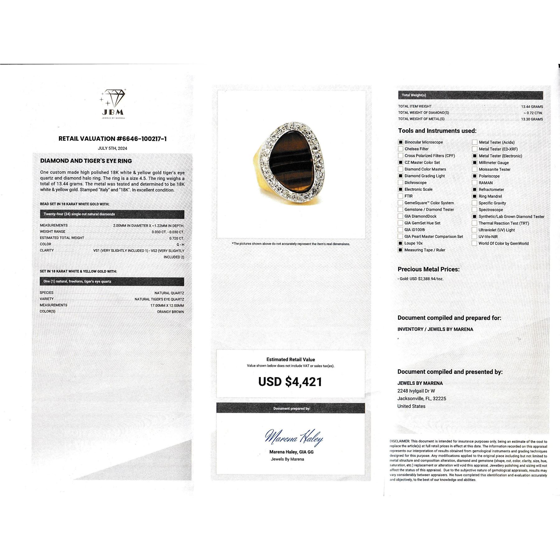 APPRAISAL REPORT: This ring is certified and appraised for $4,421.00 estimated retail replacement value.