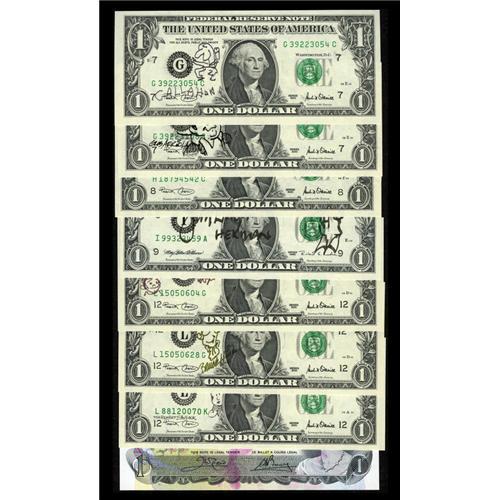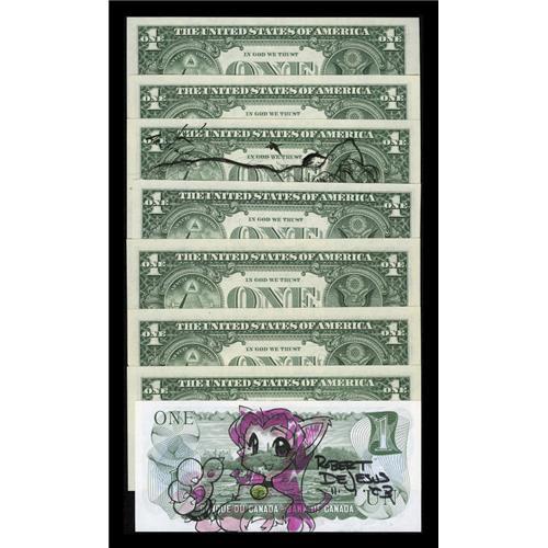 <B>Cartoonist Revue.</B></I><BR> Seven $1 FRNs and one $1 Canadian note have had the following cartoontist's work laid down on them - John Armbruster, Gus Arriola, John Callahan, Robert DeJesus, Irwin Hasen, Bruce Higdon, Margaret Shulock, and Jim Unger.<BR><BR><b>Shipping:</b> Coins & Currency (<a target="_blank" href="http://www.heritageauctions.com/common/shipping.php">view shipping information</a>)