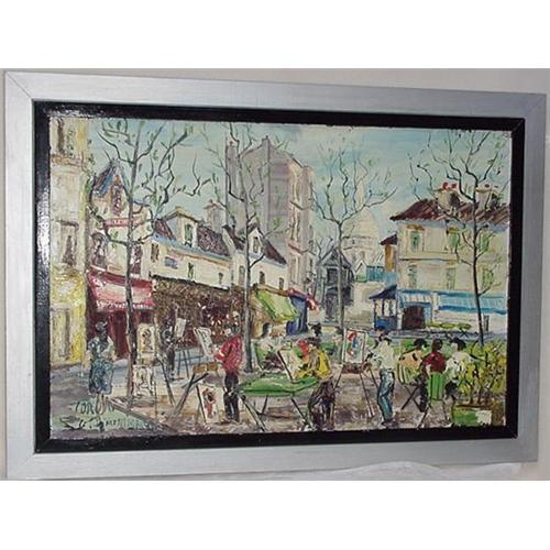 A large oil painting of a town square with a gathering of atrists painting, each artist at his canvas. The scene likely Paris includes people enjoying themselves at an outdoor café. The painting is signed, If you can make it out. Silver and black frame is 37" X 26 1/2". Condition is good, there is some crazing to paint in area just left of center.