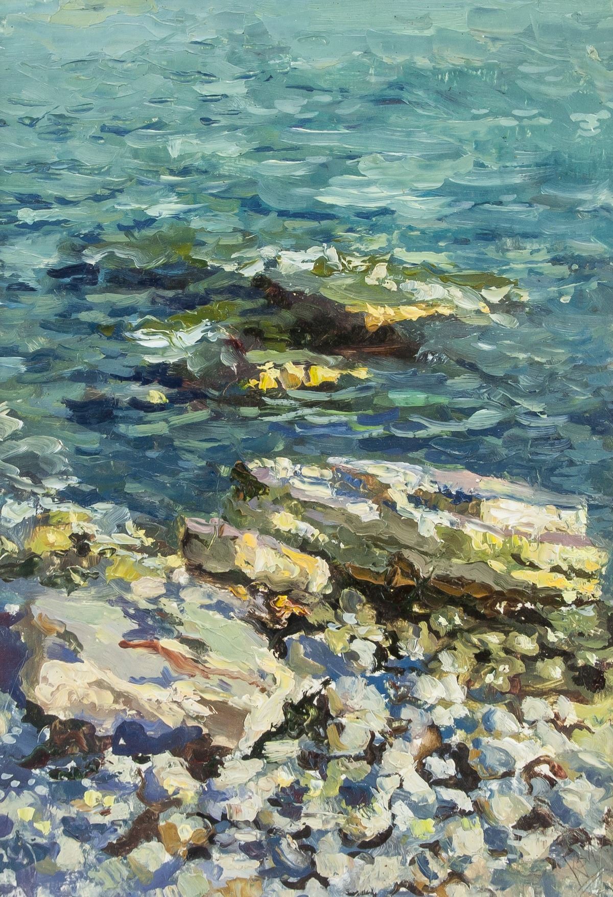 Oil on paper, framed. Featuring a seaside landscape scene. Signed "KPM" by the artist on the lower right corner. 29 x 20 cm (11.5 x 7.8 inches) framed: 49 x 40 cm (19.3 x 15.7 inches)
