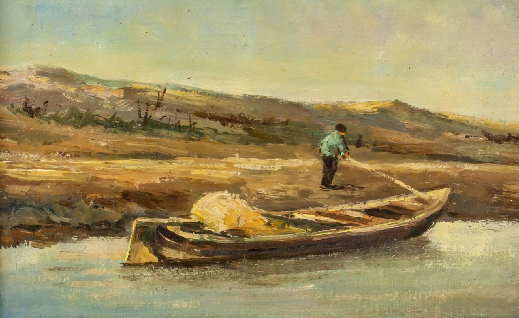 Oil on board, framed. Featuring a man next to a river and a boat. Signed by the artist on the lower right corner. 29 x 39 cm (11.4 x 15.4 inches), frame: 39 x 49 cm (15.4 x 19.3 inches). PROVEVNANCE: Private German collection (Bayern)