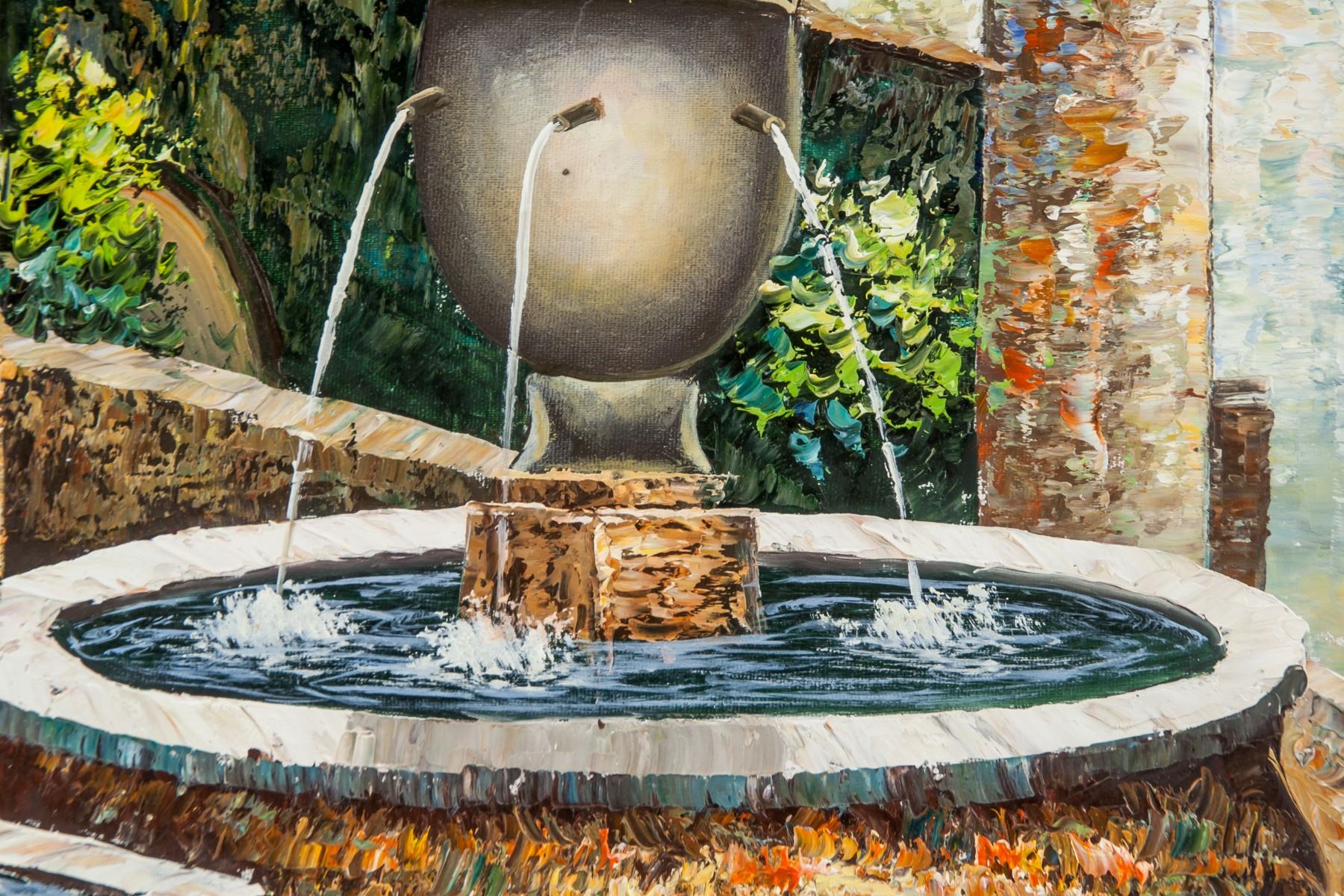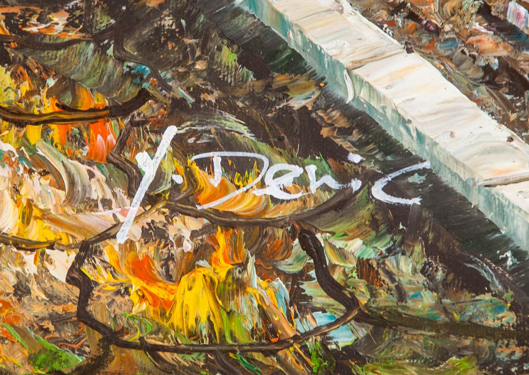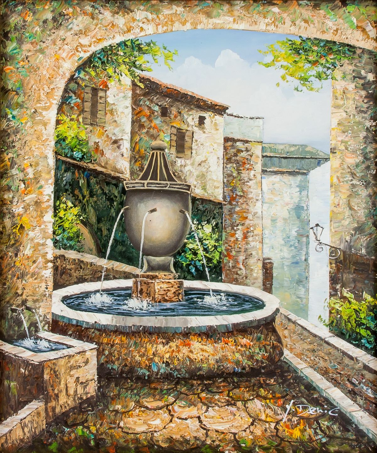 Oil on canvas, framed. Featuring a landscape scene of a courtyard with a water fountain. Signed Y Denis in the lower right corner. 60 x 49 cm (23.75 x 19.3 in.) Framed size: 65 x 75 cm (25.5 x 29.5 in.)