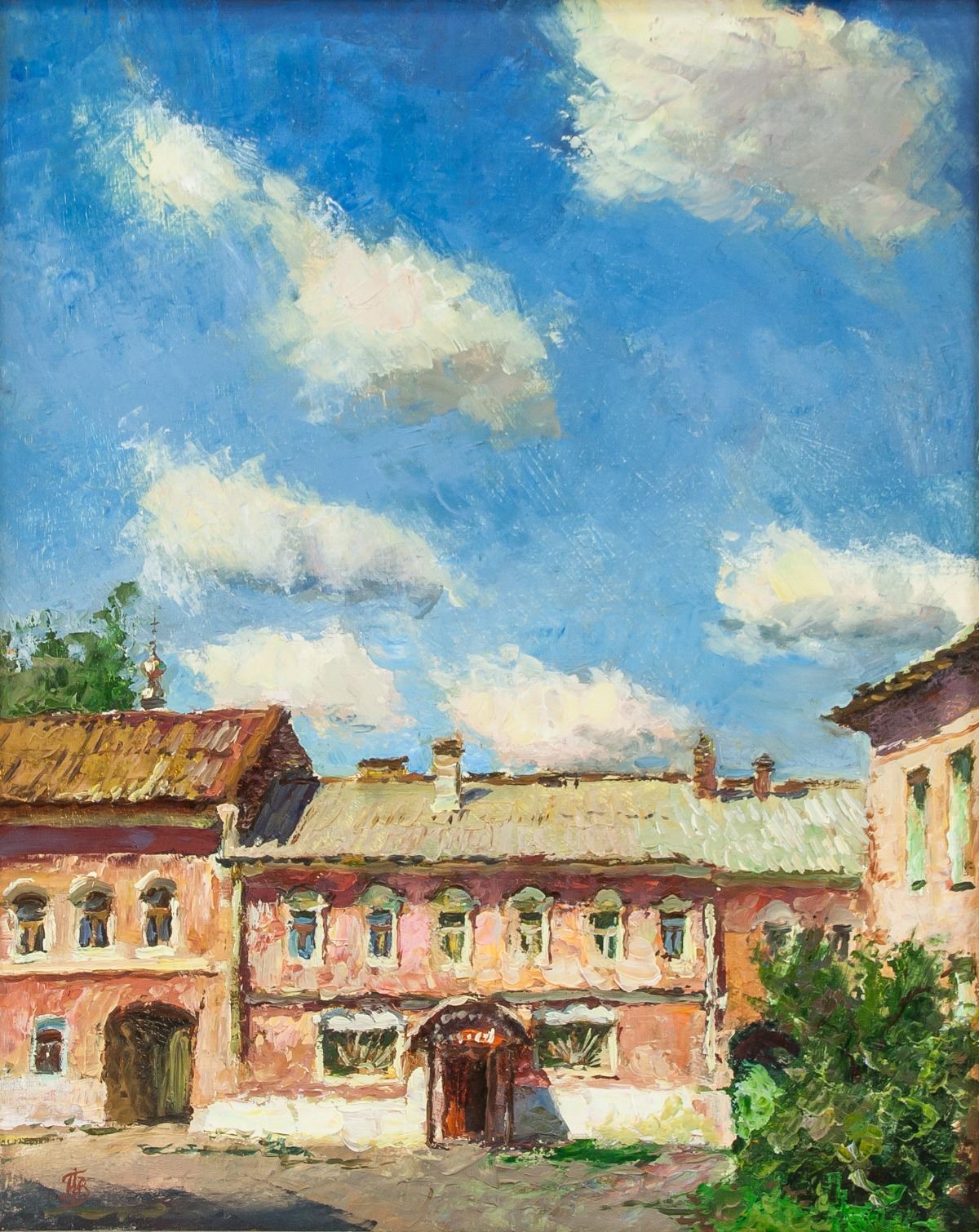 Oil on canvas, framed. Featuring a beautiful village landscape scene. Signed by the artist in Russian on the lower left corner. Inscribed in red ink 13X16 C.i B.41 on verso. 40 x 32 cm (15.7 x 12.6 inches), framed: 55 x 62 cm (21.5 x 24.5 inches)