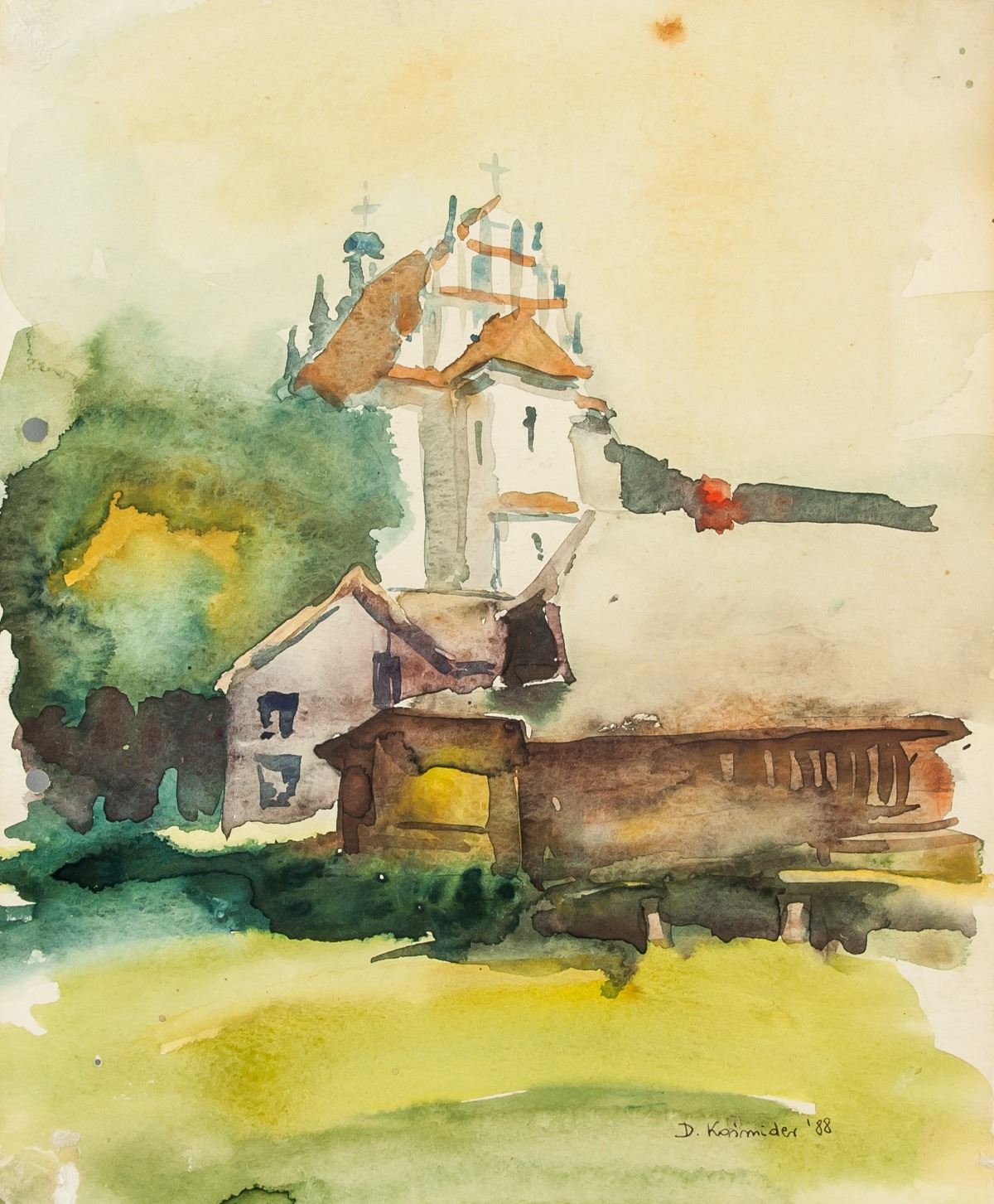 Watercolor on paper. Featuring a village scene. Signed by the artist on the lower right corner, dated 1988. 28 x 23 cm (11 x 9 inches)