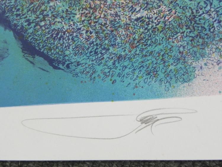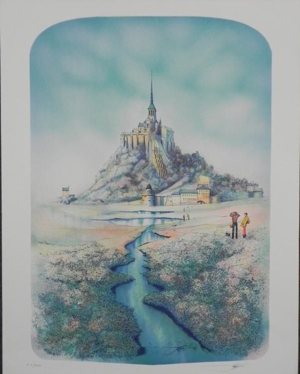 A winding brook leads to a cathedral on the hill in this vivid, fantasy inspired art print.Signature: Signed by artist in penicl, lower right margin Medium: Print on paperEdition: 216/325, lower leftImage size: 18" x 25 1/2"Sheet size: 22" x 28"Condition: Excellent; corner crease upper right, easily matted out