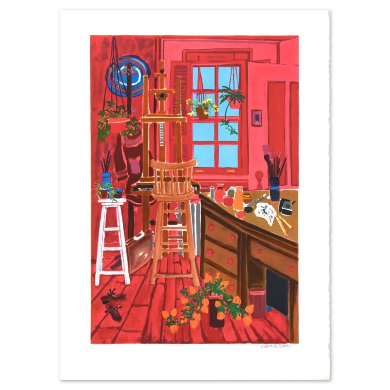 "Artist Studio" is a limited edition lithograph on paper by Edward Sokol, numbered and hand signed by the artist. Includes Letter of Authenticity.Measures approx. 20" x 27.5" (with border), 16" x 24" (image). Please note: there are minor imperfections in the white border area that may be concealed when the piece is framed.