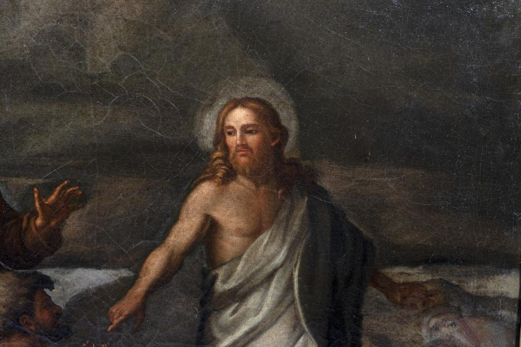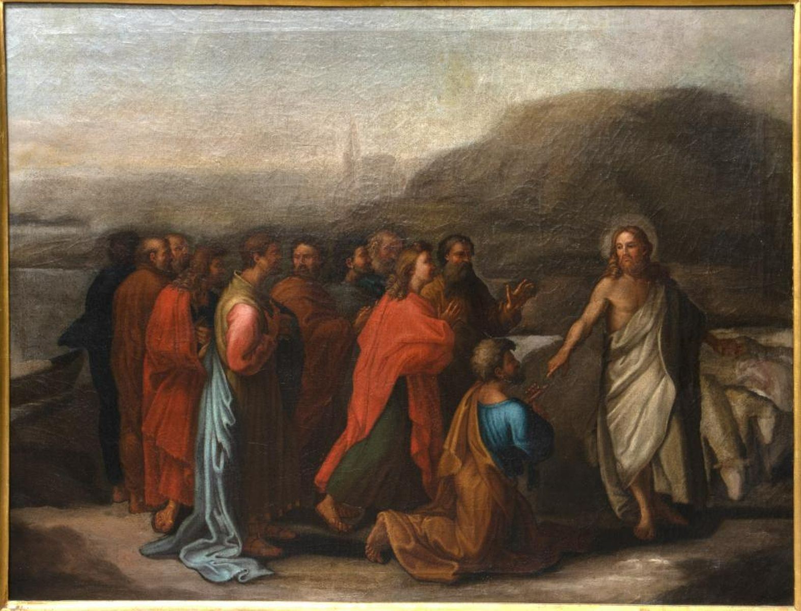 Title: Christ and His Disciples. Medium: Oil on canvas. Dimensions: 29 x 38 in. (image); 36 x 45 x 3 in. (frame). Condition: canvas relined, craquelure throughout.