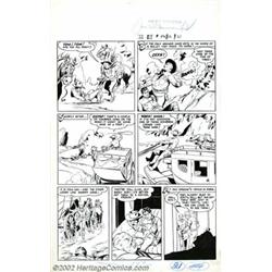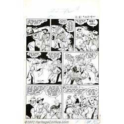 Artist Unknown - Original Art to Complete Story for Tom Mix #42 (Fawcett, 1951). This is a very nice seven page story entitled "Tom Mix and the Bullets of Hate." It was rendered by an artist who exhibits an excellent knowledge of anatomy, perspective and action sequences. His minimalist approach to line, coupled with solid black shadows produce striking compositions within the confines of each panel. The cave scene on the sixth and seventh pages contain awesome panels that use the cave entrance and surrounding shadows as a framing device for the characters. Tom Mix and the local sheriff are also shown getting shot by bushwhackers! Each page contains minor editorial markings but, otherwise, are exceptionally clean pieces. Only the "Tom Mix" in the title is a stat. The pages measure 14.25"x22.75" with image areas of approximately 13"x18". Important notice: We expect to be auctioning lots at the rate of 200-250 per hour. Sometimes eBay Premier live bid software cannot keep up with that pace, so we strongly recommend that you place a realistic proxy bid now as insurance to avoid disappointment. Also please note that all Heritage/CAA lots purchased through eBay Premier carry a 20% Buyer's Premium. Please make sure you read the Terms and Conditions.