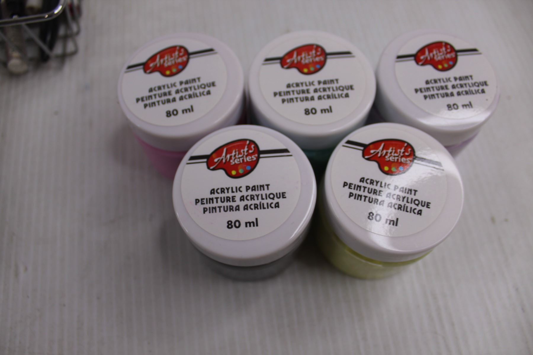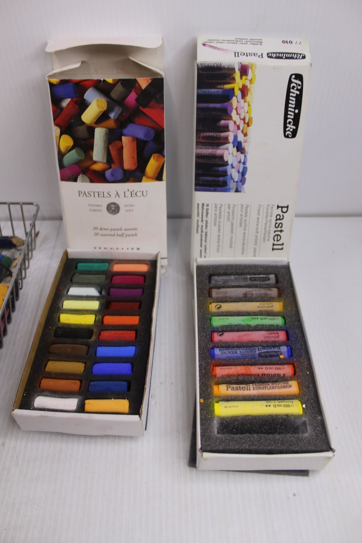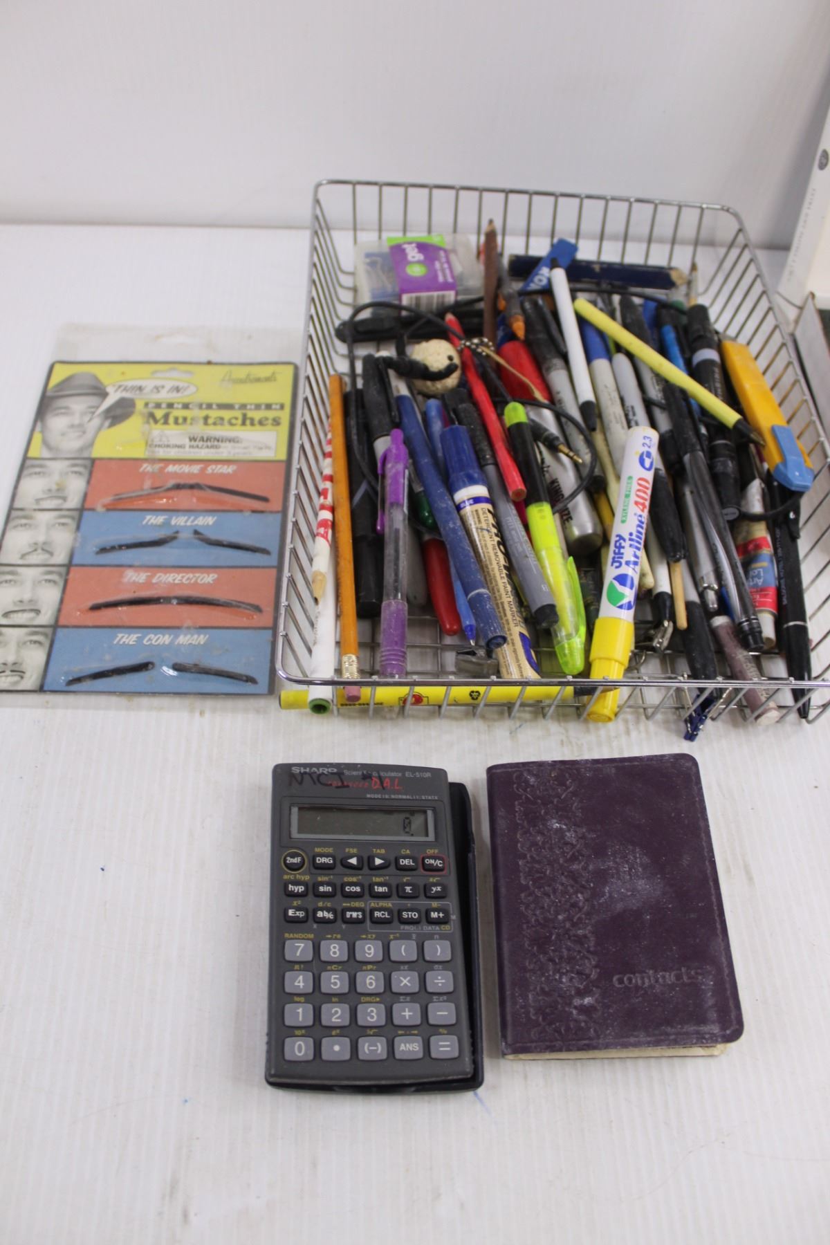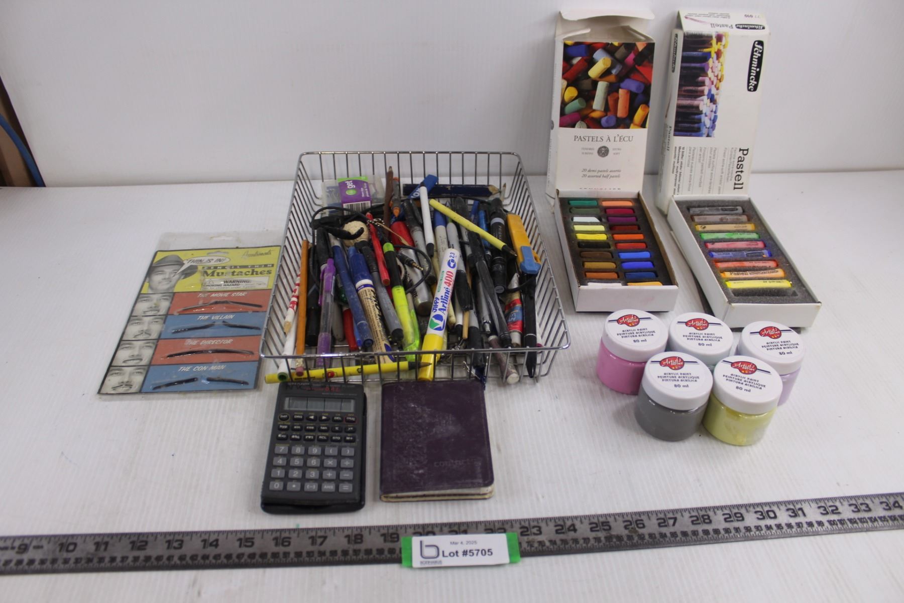 Artist's Lot (Pastels & Paints), Scientific Calculator, Pencil Thin Mustaches, Assorted Writing Utensils, Misc.