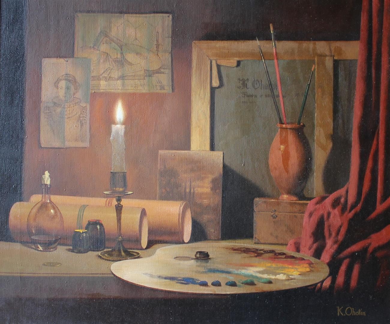 A lit candle, a paint palette, sketches, the artist's name on the back of a painting - these are some of the items that draw you into believing you're looking at Konstantin Ohotin's actual studio setting. The oil on canvas measures 19.5 x 23.5; framed image measures 31.5 x 35.5.