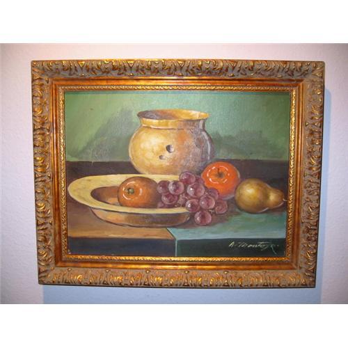 This beautiful 15 inch still life oil painting on canvas represents Italian fruits, jar and platter with A. Montoya artist's signature. This Italian style painting is vibrant and the fruits are enlighting. The stroke of artists's brush is very artistic and very professional. The color are exquisite. The frame is giltwood and decorated. It is 16 inch wide. This painting is in very good condition,vintage imperfection. a visible line.