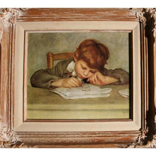 This print, based on original oil on canvas painting by the renowned French Impressionist Pierre Auguste Renoir, is truly remarkable. Originally painted in the French Impressionist style of the 19th century, this print displays a young child dressed in 19th century white attire. With strawberry blond hair, the child has a thoughtful facial expression while they focus on their drawing. The child?s pale skin is highlighted by their rosy cheeks and pink pursed lips. The shading and highlighting by the artist is impeccable and accented nicely by the light greenish-blue background. The artist leaves their signature mark of large, well-sculpted blue eyes and cherub-like faces which are characteristic to many of Renoir?s other works. At 14.75? x 12.75?, this print on a canvas-looking background is elegantly framed in a pecan white-washed ornate wooden frame with a cream liner.