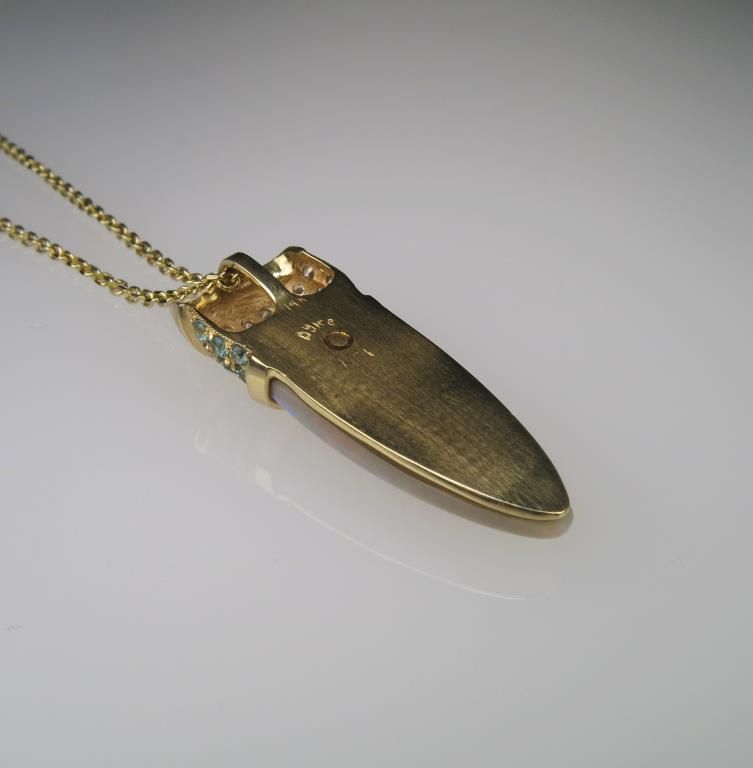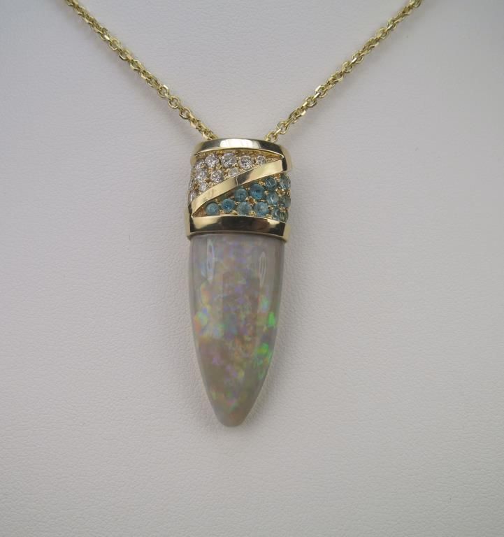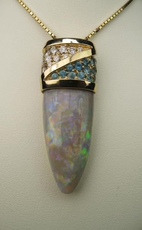 Artistic Opal, Diamond and Blue Zircon Pendant with 10.00 carat Opal with vibrant red, orange, green and blue flash fire patterns accented with 14 round cut Diamonds weighing 0.50 carats F-G colors with VS1 clarity and 15 round cut BlueZircon weighing 0.75 carats with VS clarity. Pendant is made in 14 karat yellow gold with 14 karat yellow gold 24” chain. Please See Full Appraisal. Retail $5,600-$6,000 Estimate $2,000-$3,000