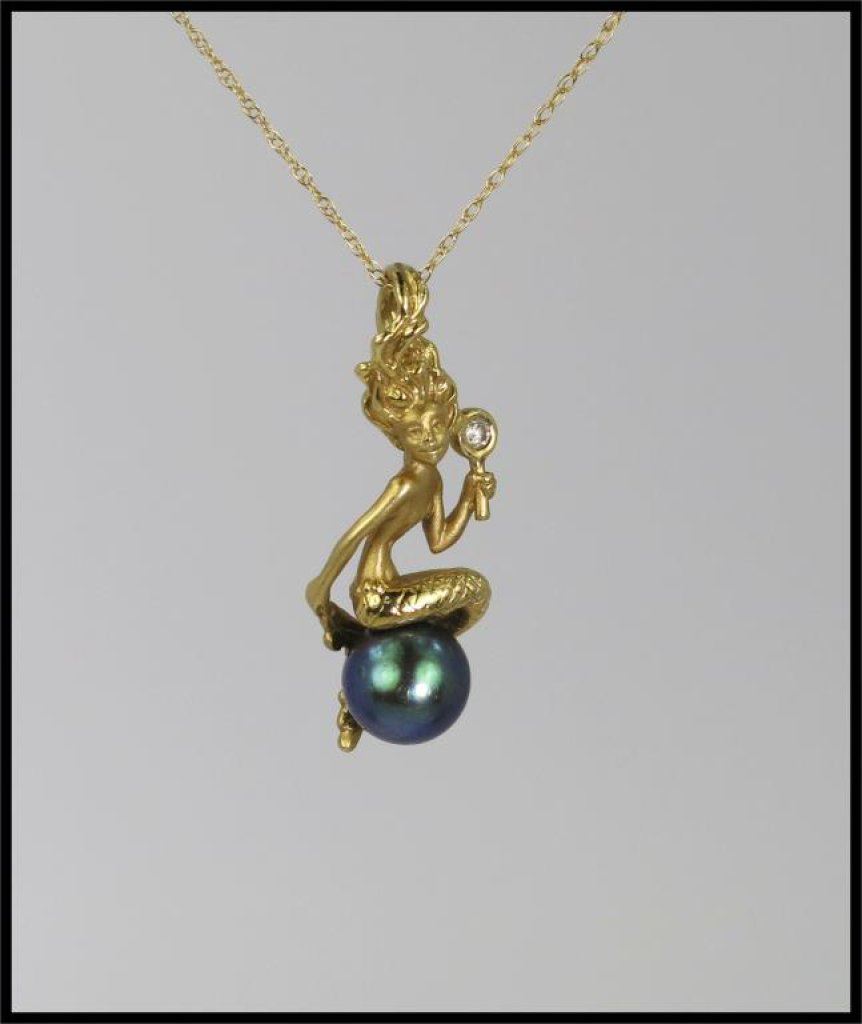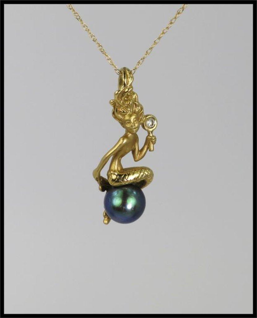 Artistic and Beautifully Detailed Black Pearl Mermaid Pendant with small diamond accent pearl measuring 3.00 mm in diameter, must see up close to appreciate crafted in 14 karat yellow gold. NEW Piece. Retail $800-$1,200 Estimate $500-$600