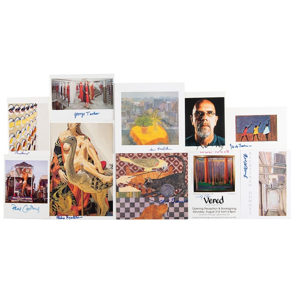 Group of ten artist's postcards and exhibition announcements, each signed in ink by the affiliated artist. Includes: Rackstraw Downes, Will Barnet, Wolf Kahn, George Tooker, Jane Freilicher, Jacob Lawrence, Paul Cadmus, Chuck Close, Wayne Thiebaud, and Philip Pearlstein. In fine condition, with a crease to the corner of the Pearlstein card.