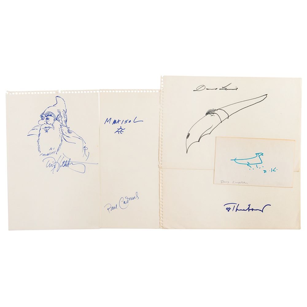 Five items signed by artists, comprising cards and sheets ranging in size from 5 x 3 to 9 x 6, with a few adding sketches. Includes: Wayne Thiebaud, Dong Kingman, Marisol and Paul Cadmus, David Levine, and Tim Hildebrandt. In overall fine condition.