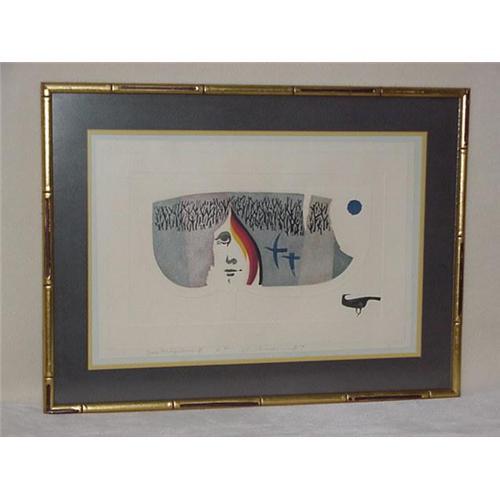 A 20th century etching titled "Nostalgia 8" 15 1/2" X 20 3/4" in a gold leaf bamboo frame, deouble matted with non-glare glass. The signature is unreadable, the letters AP are after the title signifying that this is an artists proof of which there are eight copies. Condition is very good.