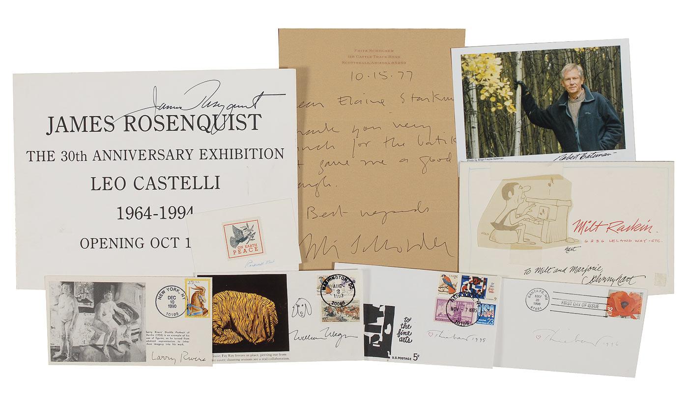 Nine signed items consisting of commemorative covers, signatures, signed photo, letter, and program, each signed by a different artist or illustrator. Signers are: Larry Rivers, William Wegman, adding a small dog sketch, Wayne Thiebaud (2), Johnny Hart, Rockwell Kent, James Rosenquist, Robert Bateman, and Fritz Scholder. In fine overall condition.