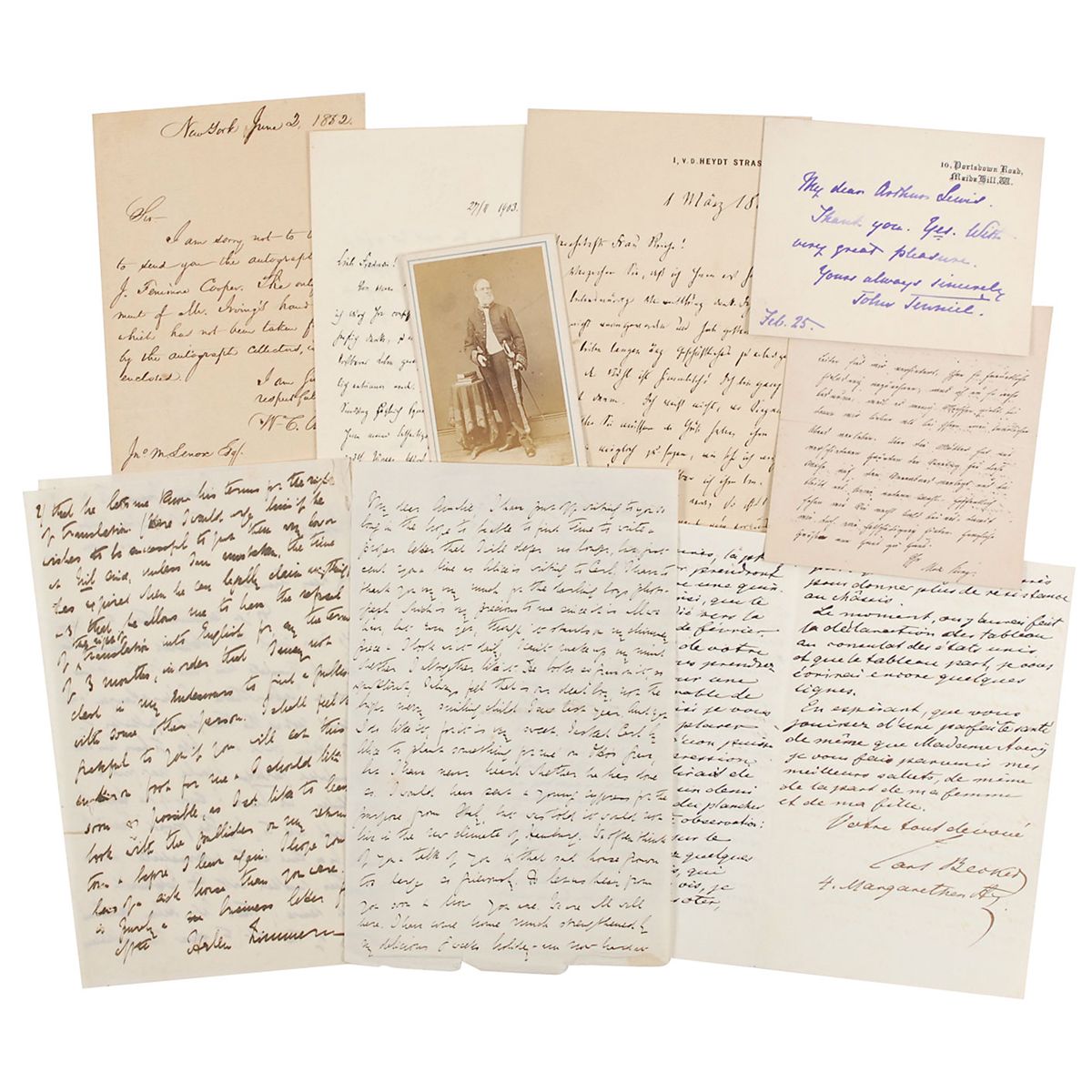 Collection of nine items, each signed by a notable artist or writer, including: William Cullen Bryant (ALS), John Stevens Cabot Abbott (CDV), Helen Zimmern (two ALSs), Max Ring (ALS), Paul Lindau (two ALSs), Karl Becker (ALS), and John Tenniel (ANS). In overall fine condition. Individual descriptions are as follows: