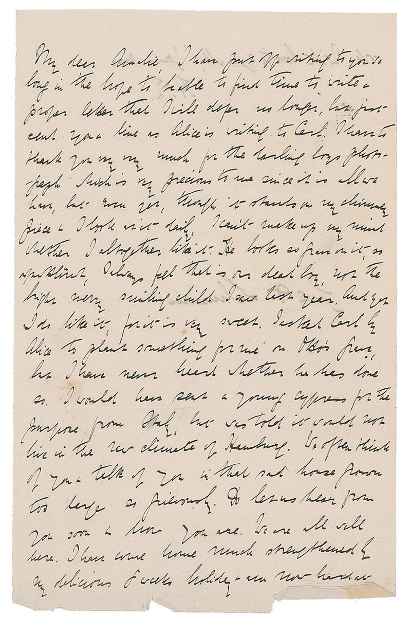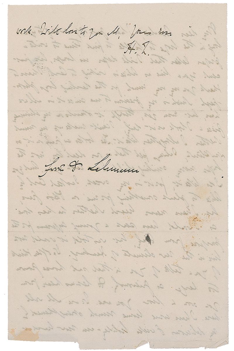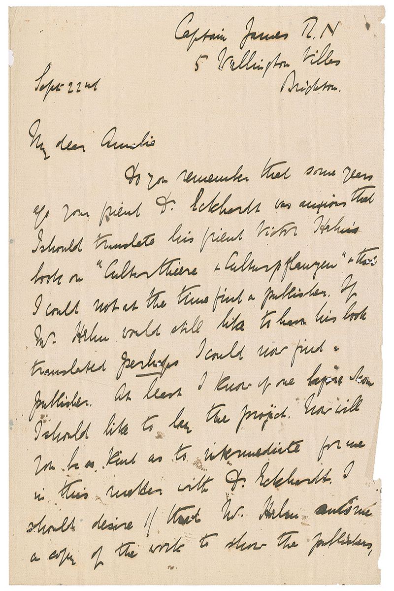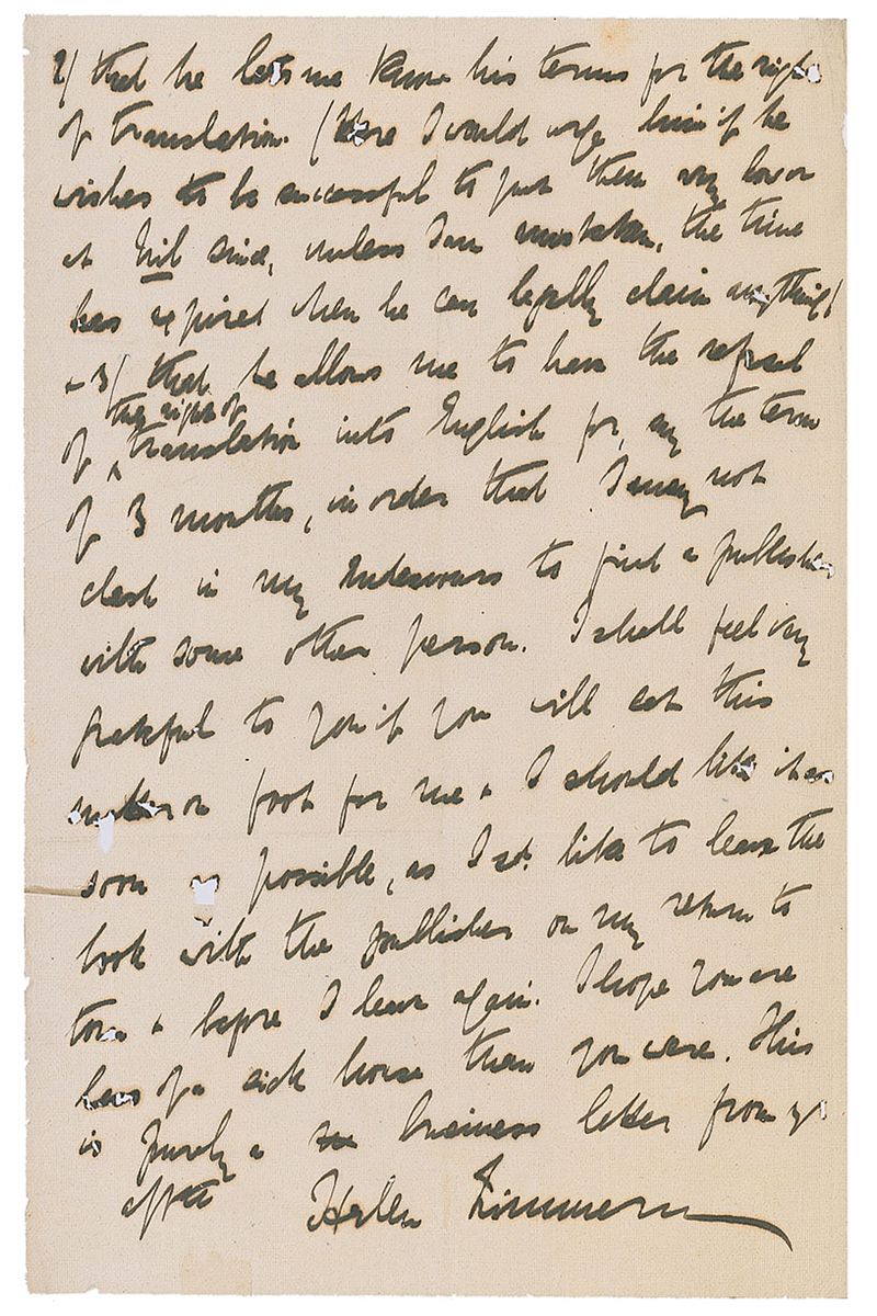 Helen Zimmern: Two ALSs, the first signed H. Z.,” one page both sides, 5.25 x 8.25, no date; and the second signed “Helen Zimmern,” two pages on two adjoining onionskin sheets, 5.25 x 8.25, September 22, [no year]. Both addressed to “Amelie.” A few slight edge chips and tears, otherwise fine condition.