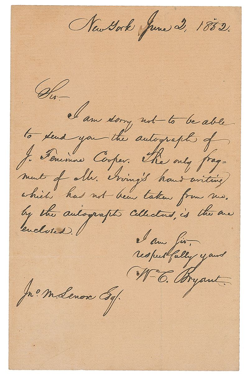 William Cullen Bryant: ALS signed “Wm. C. Bryant,” one page, 4.5 x 7, June 2, 1852. Letter to John M. Lenox, in full: “I am sorry not to be able to send you the autograph of J. Fenimore Cooper. The only fragment of Mr. Irving’s hand writing which has not been taken from me, by the autograph collectors, is the one enclosed.” In fine condition, with unobtrusive intersecting folds (one vertical fold passing through a single letter of the signature) and even overall toning.