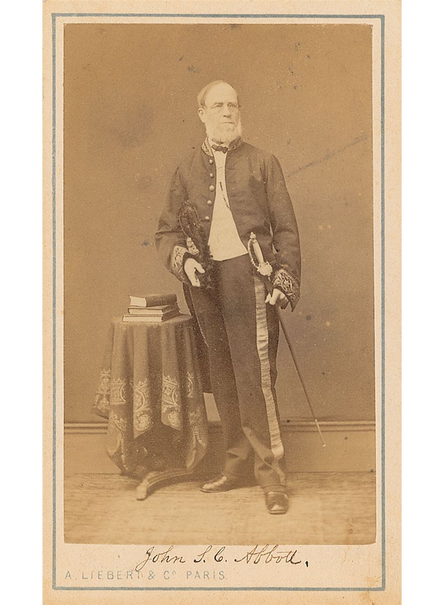 John Stevens Cabot Abbott: Original 2.5 x 4 carte-de-visite full-length portrait by A. Liebert & Co. of Paris, signed in the lower border in black ink, “John S. C. Abbott.” In fine condition with mild scattered surface marks and toning.
