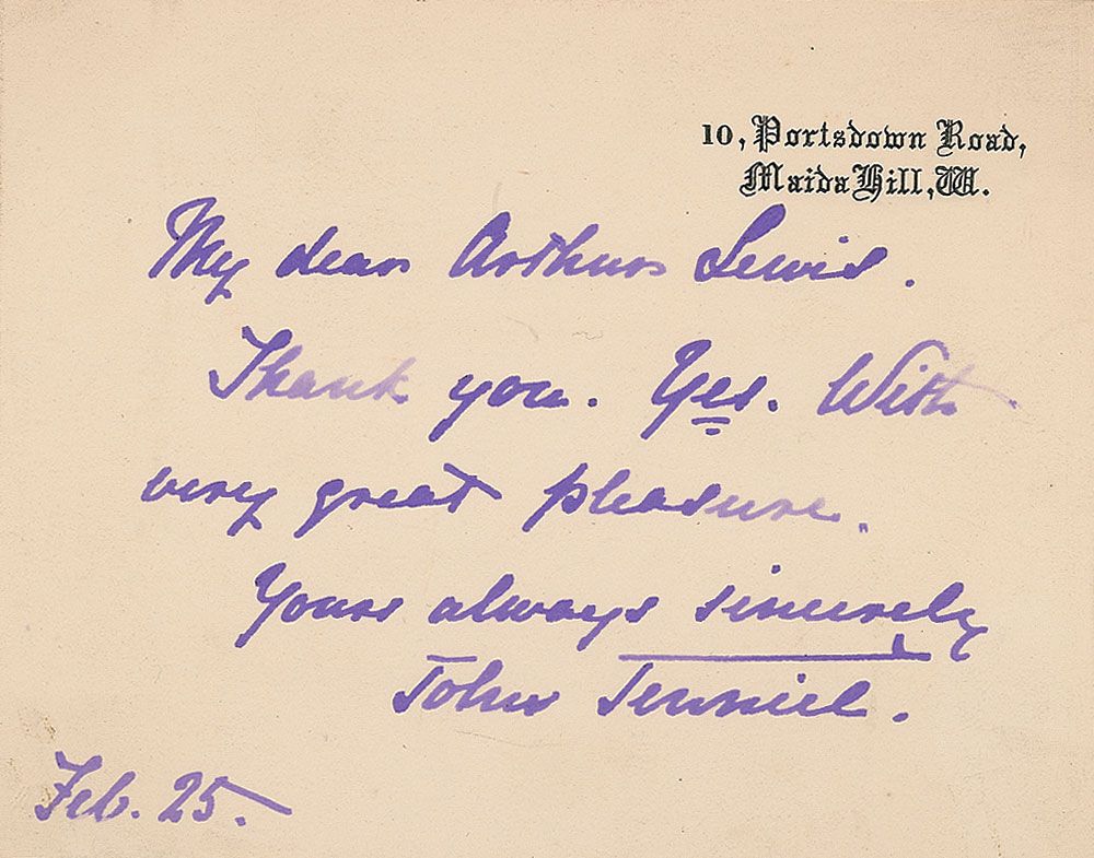 John Tenniel: ANS, one page, 4.5 x 3.5, personal stationery card, February 25, no year. Note to Arthur Lewis, in full: “Thank you. Yes. With very great pleasure.” In fine condition, with a few areas of writing a shade light.