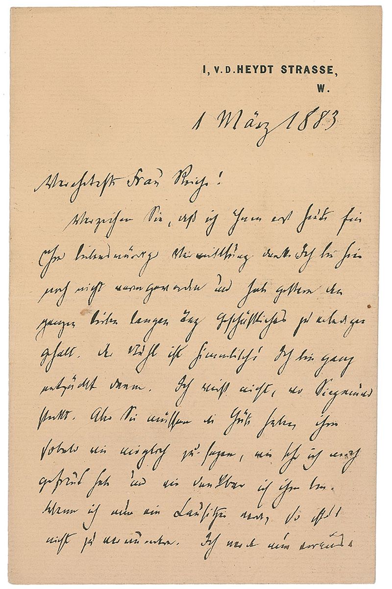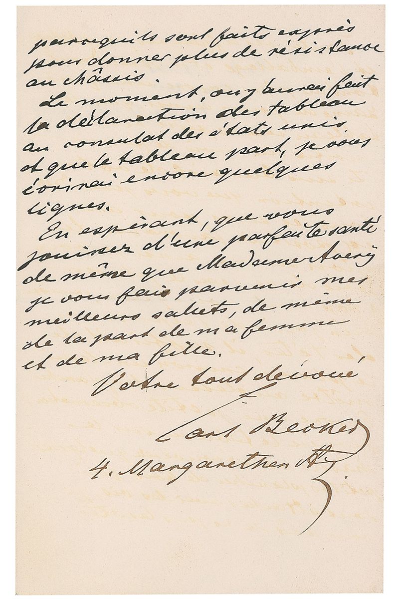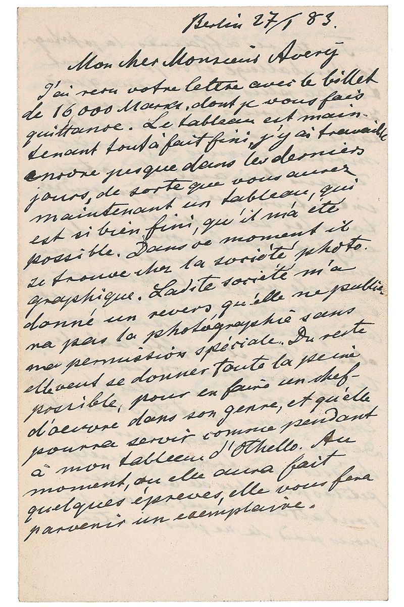 Karl Becker: Boldly-penned ALS in German, three pages on two adjoining sheets, 4.25 x 7, January 27, 1883. Untranslated letter to S. P. Avery of New York, who purchased Becker’s ‘The Venetian Girl’ and ‘Gratulantin’ paintings. In very fine condition.