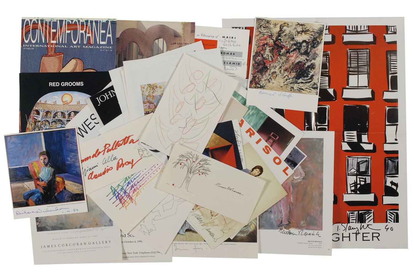 Collection of 43 items consisting of postcards, color reprint reproductions, sketches, magazine covers and pages, and book pages, each signed in ink or felt tip by the respective artist represented. Signers are: John Chamberlain, Tom Wesselmann, Ed Ruscha, Ellsworth Kelly, Duane Hanson, Francesco Clemente, Eric Fischl, Peter Halley, Red Grooms, Ralph Goings, Robert Indiana, Wayne Thiebaud, David Hockney (rubber-stamped signature), Bridget Riley, Howard Hodgkin, Gilbert & George, Georg Baselitz, Richard Diebenkorn, William T. Wiley, Christo, Richard Artschwager, Eduardo Chillida, Julie Wachtel, Tom Slaughter, Carol Summers, Bernard Schultze, Dorothea Rockburne, Theodoros Stamos, Milton Resnick, Herbert Ferber, William Wegman, R. B. Kitaj, Ernest Trova, Marco Sassone, Nassos Daphnis, Hans Burkhardt and Marisol; and original sketches by Yaacov Agam, glass artist Dale Chihuly, sculptor Chaim Gross, Stevan Dohanos, the Italian art collective Plumcake and the Russian Pop/Sots artist duo Komar and Melamid. In fine overall condition.