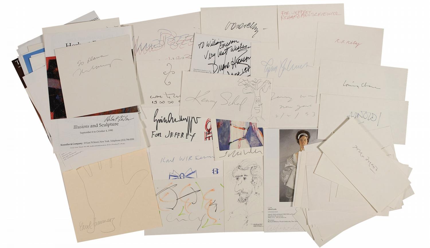 Collection of 66 items consisting of postcards, sketches, signatures, book and magazine pages, and small color prints, each signed in ink or felt tip by the respective artist or photographer. Signers are: Tom Wesselmann, Chuck Close, Mel Ramos, Yvaral (Vasarely), Louise Bourgeois, Karel Appel, Sam Francis, Wayne Thiebaud, David Hockney (stamped signature), George Segal, Faith Ringgold, Hunt Slonem, Bernard Buffet, Bryan Hunt, Eduardo Chillida, Donald Sultan, Jules Olitski, Peter Halley, Herbert Ferber, Nancy Graves, Fritz Scholder, Duane Hanson and Alfred Leslie; cards signed by Ed Ruscha, Alex Katz, Robert Indiana, Victor Vasarely, Richard Anuszkiewicz, Terry Winters, Lynn Chadwick, R. B. Kitaj, Louisa Chase, Charles Arnoldi, Gregory Amenoff, Ross Bleckner, Alan Shields, Antonio Frasconi, Piero Dorazio, Laurie Simmons, Helmut Federle, Gilbert & George, Will Barnet, Marco Sassone, Jennifer Bartlett, Jacob Lawrence, Jack Levine, Lynda Benglis, Neil Welliver, R. M. Fischer, Wolf Kahn, David Salle, Matt Mullican, Nancy Kienholz, Bill Jensen, James Valerio, Michele Zalopany, Richard Diebenkorn and Henriette Wyeth, and signed original sketches by Pop Surrealist Kenny Scharf, glass artist Dale Chihuly, Leonardo Nierman, William T. Wiley, Lucio Pozzi, Chicago Imagist Karl Wirsum, Carol Summers and the eccentric Austrian painter Hundertwasser. In fine condition.