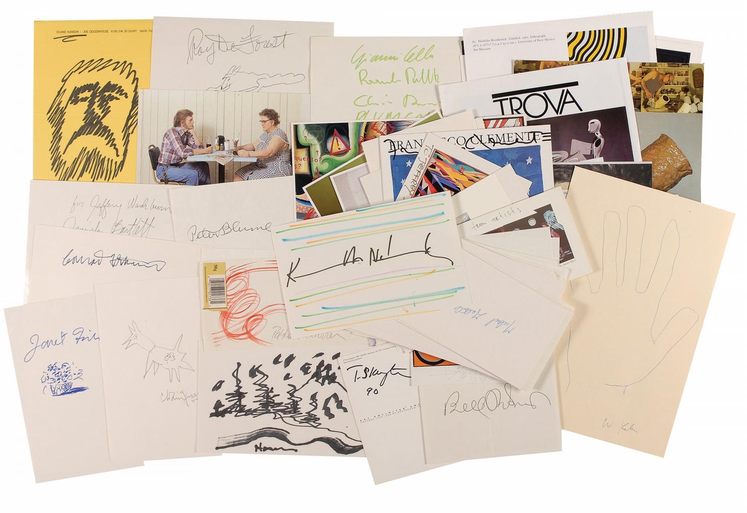 Expansive collection of 72 items including full-color (clipped) bookplate and magazine reproductions individually signed by John Chamberlain, Claes Oldenburg, Brice Marden, Georg Baselitz, Richard Long, Francesco Clemente, Kenny Scharf, Ed Paschke, Ernest Trova, Anthony Caro, Wolf Kahn, Dorothy Hood, Hans Burkhardt, Emil Schumacher, Richard Artschwager, Robert Morris, Nicholas Krushenick, Komar & Melamid, Al Hirschfeld, Giancarlo Impiglia, Tom Slaughter, William Morehouse and Billy Al Bengston. Plus, signatures of Richard Avedon, Hans Namuth, Dan Flavin, Larry Rivers, Tony Berlant, Peter Blume, Robert Kipniss, Jennifer Bartlett, Edna Hibel, Judy Pfaff, John Clem Clarke, Ed McGowin, R. C. Gorman, Thomas McKnight, Chuck Arnoldi, Rackstraw Downes, Theodore Stamos, Michael Goldberg, Conrad Atkinson, Marisol, Leonard Baskin, Alan Shields, Joseph Glasco, Richild Holt, Nell Blaine, Antonius Hockelmann, Robert Kushner, Bernhard Schulte, George Condo, Robert Arneson, Dorothea Rockburne, Plumcake, Jiri Kolar, Philip Pearlstein, Mark Kostabi, LeRoy Neiman and Frank Auerbach; and signed original sketches by Kenneth Noland, Arman, Roy DeForest, Janet Fish, Chaim Gross, Wolf Kahn, Pablo Echaurren, Rainer Fetting, and Yaacov Agam. Also included are four additional artist signed items. In overall fine condition.
